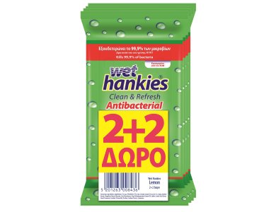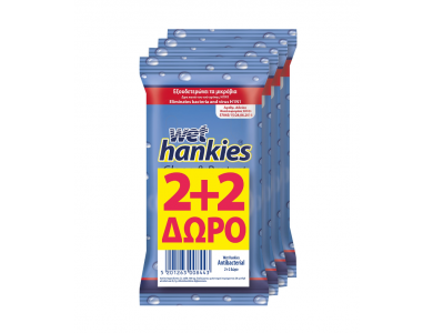 Wet Hankies Μαντηλάκια αντιβακτηριδιακά. Mε αιθυλική αλκοόλη 4x15τεμ, 2+2 Δώρο Υγρά αντιβακτηριδιακά...