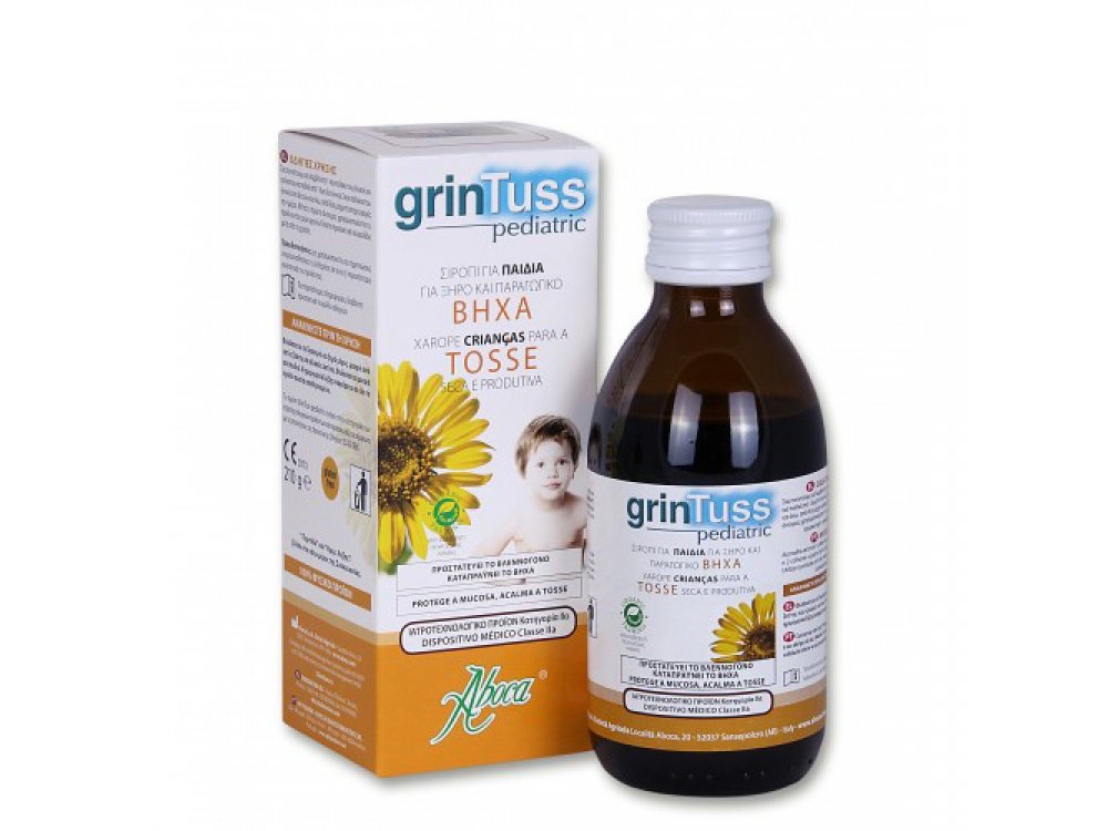Aboca Grintuss Pediatric Sirop Enfants Το σιρόπι GrinTuss ενηλίκων και παιδικό δημιουργεί ένα προστατευτικό φιλμ με δράση ''φραγμού'' που ηρεμεί το βήχα προστατεύοντας την ανώτερη αναπνευστική οδό. Είναι σχεδιασμένα για να προστατεύουν τον βλεννογόνο εμποδίζοντας την επαφή με εξωτερικούς παράγοντες. Παράλληλα ενυδατώνουν τις βλέννες διευκολύνοντας την απομάκρυνση τους. Τα λυοφιλοποιημένα εκχυλίσματα του Πλανταγκο, Γκριντέλιας και Ελίχρυσου που υπάρχουν στην σύνθεση του GrinTuss παρουσιάζουν βλεννοπροσκολλητικές ιδιότητες χάρη στη δράση των φυσικών ουσιών που περιέχουν όπως βλεννοπολυσακχαρίδια, κόμμι και ρητίνες. Το μέλι έχει μια προστατευτική και μαλακτική δράση, προσδίδοντας στο προϊόν μια ευχάριστη γεύση η οποία συμπληρώνεται από την δροσιστική δράση των αιθερίων ελαίων. 180gr