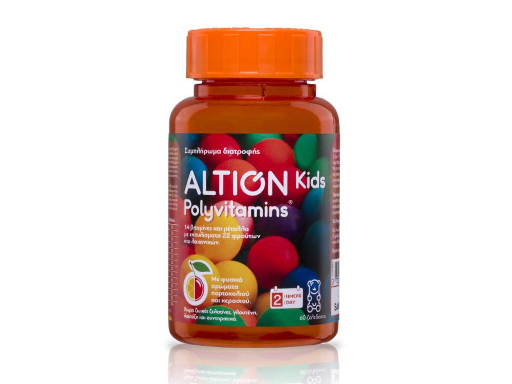 To VIANEX Altion Kids Polyvitamins είναι παιδικές πολυβιταμίνες με 14 βιταμίνες και μέταλλα με εκχυλίσματα από 22 φρούτα και λαχανικά σε ζελεδάκια. Με φυσικά αρώματα πορτοκαλιού και κερασιού Με καπάκι ασφαλείας Χωρίς ζελατίνες ζωικής προέλευσης, γλουτένη, λακτόζη και συντηρητικά. Το Altion Kids Polyvitamins περιέχει βιταμίνες: Α και Β2: οι οποίες συμβάλλουν στο φυσιολογικό μεταβολισμό του σιδήρου βιταμίνες Β1, Β2, Β3, Β5, Β6 και Β8: οι οποίες συμβάλλουν στη φυσιολογική λειτουργία των μεταβολικών διεργασιών που αποσκοπούν στην παραγωγή ενέργειας βιταμίνες Β2, Β3, Β5, Β6 και Β9: συμβάλλουν και στη μείωση της κούρασης και της κόπωσης. πατενταρισμένο εκχύλισμα από 22 φρούτα και λαχανικά (Oxxynea): τιτλοδοτημένο σε πολυφαινόλες.