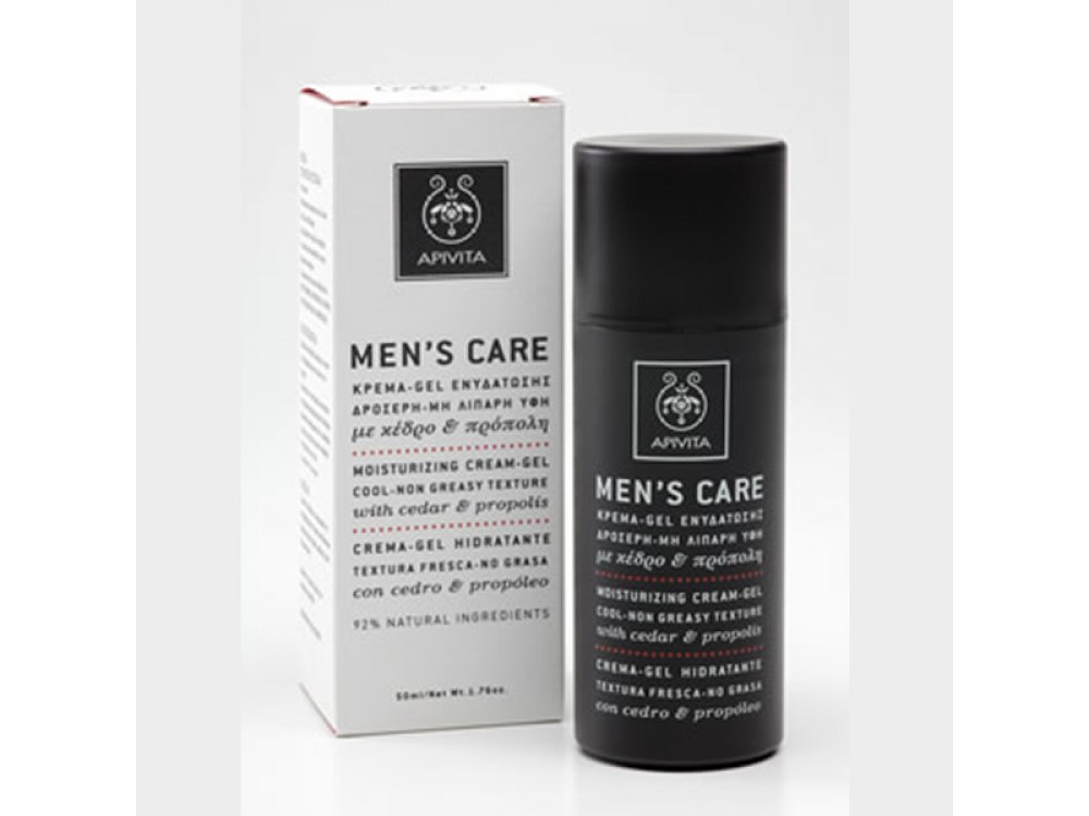 Συστατικά: Η Men’s Care Κρέμα - Gel Ενυδάτωσης έχει πλούσια φυσική σύνθεση και περιέχει 92% φυσικά συστατικά. ΜΕ: Πρόπολη, Αλόη*, Δασική Οξιά*, Ελιά*, Σημύδα, Κάρδαμο, Λάδι αμυγδάλου, Αιθέριο έλαιο κάρδαμου*, Αιθέριο έλαιο φασκόμηλου*, Αιθέριο έλαιο λεμονιού*, Αιθέριο έλαιο κέδρου*. Το νερό έχει αντακατασταθεί με έγχυμα από κάρδαμο*. *(Από πιστοποιημένες βιολογικές καλλιέργειες).