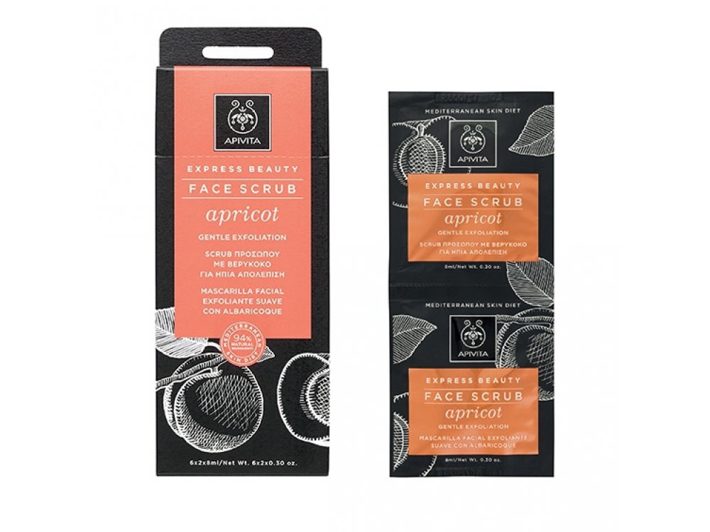 Το scrub προσώπου EXPRESS BEAUTY με βερύκοκο, ένα αγαπημένο ζουμερό φρούτο των περιοχών της Μεσογείου, ένα ζουμερό φρούτο των περιοχών της Μεσογείου καθαρίζει απαλά την επιδερμίδα χωρίς να την αφυδατώνει. Απολεπίζει απαλά την επιδερμίδα και απομακρύνει τα νεκρά κύτταρα χάρη στους λεπτούς κόκκους από κουκούτσια βερύκοκου Βελτιώνει την υφή της επιδερμίδας, αφήνοντάς την απαλή και αναζωογονημένη χάρη στο λάδι βερύκοκου, το μέλι και το αγγούρι Συμβάλλει στην ενυδάτωση και αναζωογόνηση της επιδερμίδας με αιθέριο έλαιο γεράνι Το νερό έχει αντικατασταθεί από ένα έγχυμα Ελληνικού βιολογικού τσαγιού του βουνού με αντιοξειδωτική δράση. ΚΑΤΑΛΛΗΛΟ ΓΙΑ ΟΛΟΥΣ ΤΟΥΣ ΤΥΠΟΥΣ ΔΕΡΜΑΤΟΣ ΔΕΡΜΑΤΟΛΟΓΙΚΑ ΕΛΕΓΜΕΝΟ