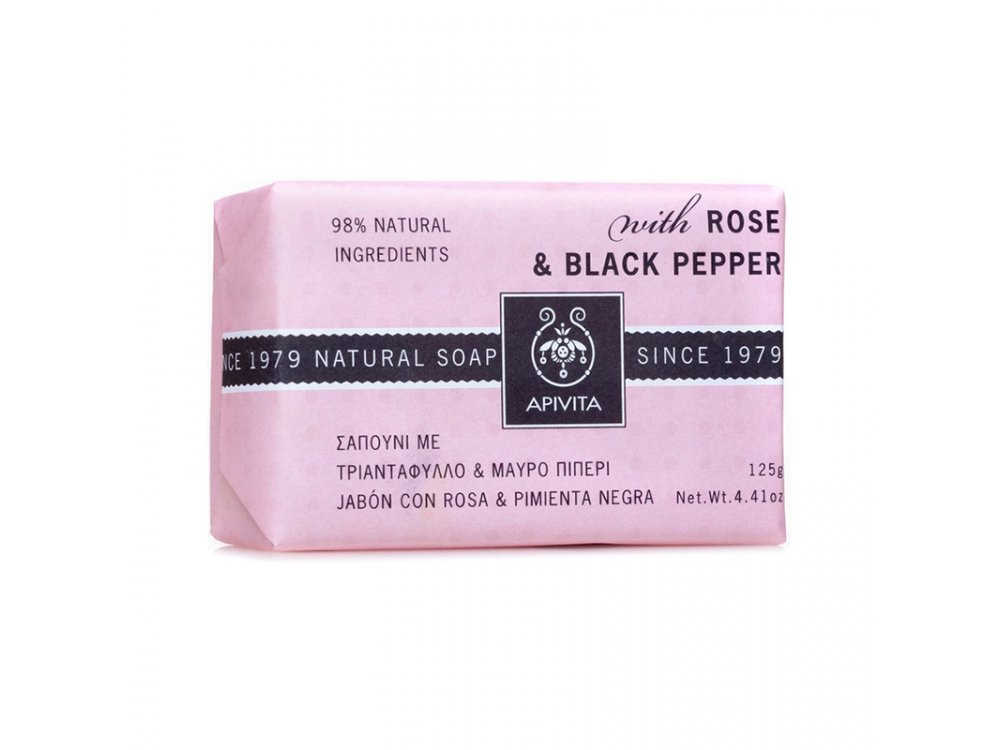 Σαπούνι με τριαντάφυλλο και μαύρο πιπέρι.Απομακρύνει τα νεκρά κύτταρα,αυξάνει τη μικροκυκλοφορία και βελτιώνει την υφή της επιδερμίδας