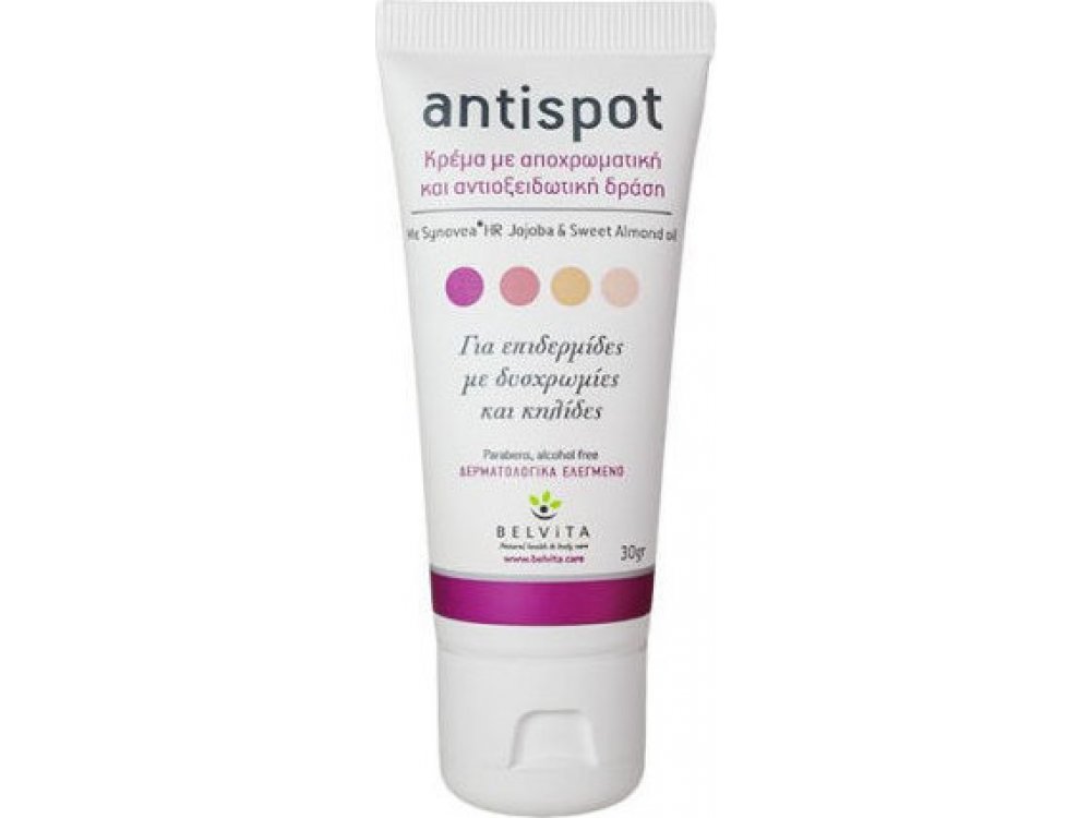 H Antispot αντιμετωπίζει αποτελεσματικά τις υπερχρωματικές αλλοιώσεις στο δέρμα, γενετικής ή περιβαλλοντικής φύσεως (κηλίδες ηλικίας, πανάδες, φακίδες καθώς και στίγματα ακραίας έκθεσης στον ήλιο). Έχει ισχυρή αντιοξειδωτική δράση, μειώνει τη μελανογένεση, περιποιείτα, ενυδατώνει και συσφίγγει το δέρμα χαρίζοντας τόνωση και λάμψη. ΧΡΗΣΗ Εφαρμόστε 2-3 φορές την ημέρα, τοπικά (πρόσωπο, λαιμό, ντεκολτέ, χέρια) σε καθαρό δέρμα, για 2-3 μήνες.