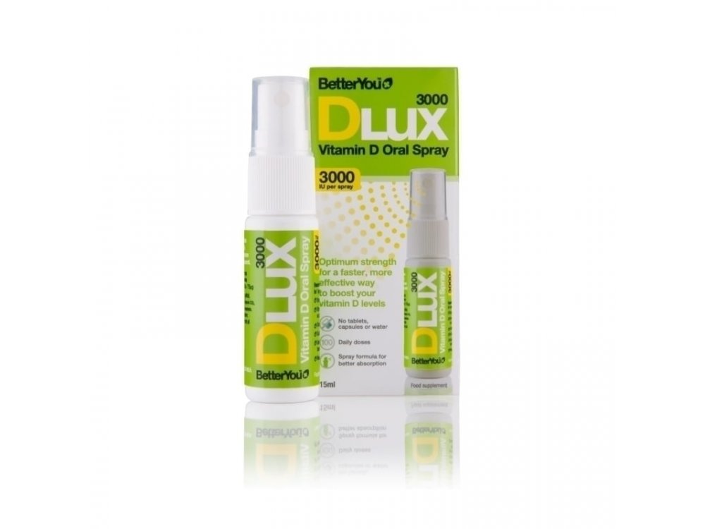 BetterYou DLux 3000 Vit.D Oral Spray Στοματικό spray βιταμίνης D για άμεση και αποτελεσματικότερη απορρόφηση. Τα σταγονίδια απορροφώνται ταχύτατα από το στόμα και η Βιταμίνη D περνά κατευθείαν στην κυκλοφορία. Το προϊόν συμβάλλει στη διατήρηση της υγείας των οστών και των δοντιών στην ενίσχυση του ανοσοποιητικού συστήματος στη φυσιολογική λειτουργία των μυών στην πρόληψη καρδιαγγειακών νοσημάτων