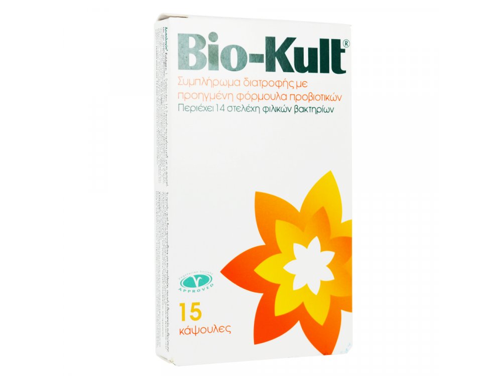 Η καινοτόμα φόρμουλα πολλαπλών στελεχών Bio-Kult, η οποία περιέχει 14 στελέχη ζωντανών βακτηρίων και είναι κατάλληλη για καθημερινή χρήση. Μπορεί να αποθηκευθεί σε θερμοκρασία δωματίου χωρίς την ανάγκη για ψύξη ή συντήρησηΕγγυημένο σύνολο έμβιων βακτηρίων μέχρι το τέλος της διάρκειας ζωής του προϊόντος (2 χρόνια)Κατάλληλο για παιδιά και έγκυες γυναίκες (συμβουλευτείτε το γιατρό ή φαρμακοποιό σας πριν από τη λήψη οποιουδήποτε συμπληρώματος διατροφής)Χωρίς γλουτένηΠεριέχει ίχνη σόγιας και γάλακτος, σε επίπεδο που δεν θα επηρεάσει όσους έχουν δυσανεξία στη λακτόζηΠαράγεται στο Ην.ΒασίλειοΚατάλληλο για vegetariansΚυτταρίνη (παράγοντας διόγκωσης), φυτική κάψουλα (Υδροξυπροπυλομεθυλο κυτταρίνη). Ισχύς προϊόντος: Ελάχιστη ποσότητα ζωντανών βακτηρίων στα 2 δισεκατομμύρια ανά κάψουλα (2?109 CFU / κάψουλα), που ισοδυναμεί με 10 δισεκατομμύρια ζωντανών βακτηρίων ανά γραμμάριο (1?1010 CFU / gram) Φύλαξη: Φυλάσσεται σε δροσερό και ξηρό μέρος ? δεν χρειάζεται ψυγείο ή κατάψυξη. Συστατικά: Ζωντανές καλλιέργειες βακτηρίων: Bacillus subtilis PXN 21Bifidobacterium bifidum PXN 23Bifidobacterium breve PXN 25Bifidobacterium infantis PXN 27Bifidobacterium longum PXN 30Lactobacillus acidophilus PXN 35Lactobacillus delbrueckii ssp. bulgaricus PXN 39Lactobacillus casei PXN 37Lactobacillus plantarum PXN 47Lactobacillus rhamnosus PXN 54Lactobacillus helveticus PXN 45Lactobacillus salivarius PXN 57Lactococcus lactis ssp. lactis PXN 63Streptococcus thermophilus PXN 66
