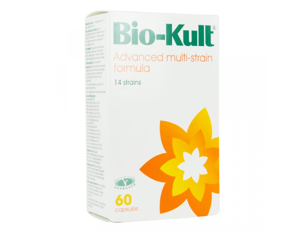 Η καινοτόμα φόρμουλα πολλαπλών στελεχών Bio-Kult, η οποία περιέχει 14 στελέχη ζωντανών βακτηρίων και είναι κατάλληλη για καθημερινή χρήση. Μπορεί να αποθηκευθεί σε θερμοκρασία δωματίου χωρίς την ανάγκη για ψύξη ή συντήρησηΕγγυημένο σύνολο έμβιων βακτηρίων μέχρι το τέλος της διάρκειας ζωής του προϊόντος (2 χρόνια)Κατάλληλο για παιδιά και έγκυες γυναίκες (συμβουλευτείτε το γιατρό ή φαρμακοποιό σας πριν από τη λήψη οποιουδήποτε συμπληρώματος διατροφής)Χωρίς γλουτένηΠεριέχει ίχνη σόγιας και γάλακτος, σε επίπεδο που δεν θα επηρεάσει όσους έχουν δυσανεξία στη λακτόζηΠαράγεται στο Ην.ΒασίλειοΚατάλληλο για vegetariansΚυτταρίνη (παράγοντας διόγκωσης), φυτική κάψουλα (Υδροξυπροπυλομεθυλο κυτταρίνη). Ισχύς προϊόντος: Ελάχιστη ποσότητα ζωντανών βακτηρίων στα 2 δισεκατομμύρια ανά κάψουλα (2?109 CFU / κάψουλα), που ισοδυναμεί με 10 δισεκατομμύρια ζωντανών βακτηρίων ανά γραμμάριο (1?1010 CFU / gram) Φύλαξη: Φυλάσσεται σε δροσερό και ξηρό μέρος ? δεν χρειάζεται ψυγείο ή κατάψυξη. Συστατικά: Ζωντανές καλλιέργειες βακτηρίων: Bacillus subtilis PXN 21Bifidobacterium bifidum PXN 23Bifidobacterium breve PXN 25Bifidobacterium infantis PXN 27Bifidobacterium longum PXN 30Lactobacillus acidophilus PXN 35Lactobacillus delbrueckii ssp. bulgaricus PXN 39Lactobacillus casei PXN 37Lactobacillus plantarum PXN 47Lactobacillus rhamnosus PXN 54Lactobacillus helveticus PXN 45Lactobacillus salivarius PXN 57Lactococcus lactis ssp. lactis PXN 63Streptococcus thermophilus PXN 66