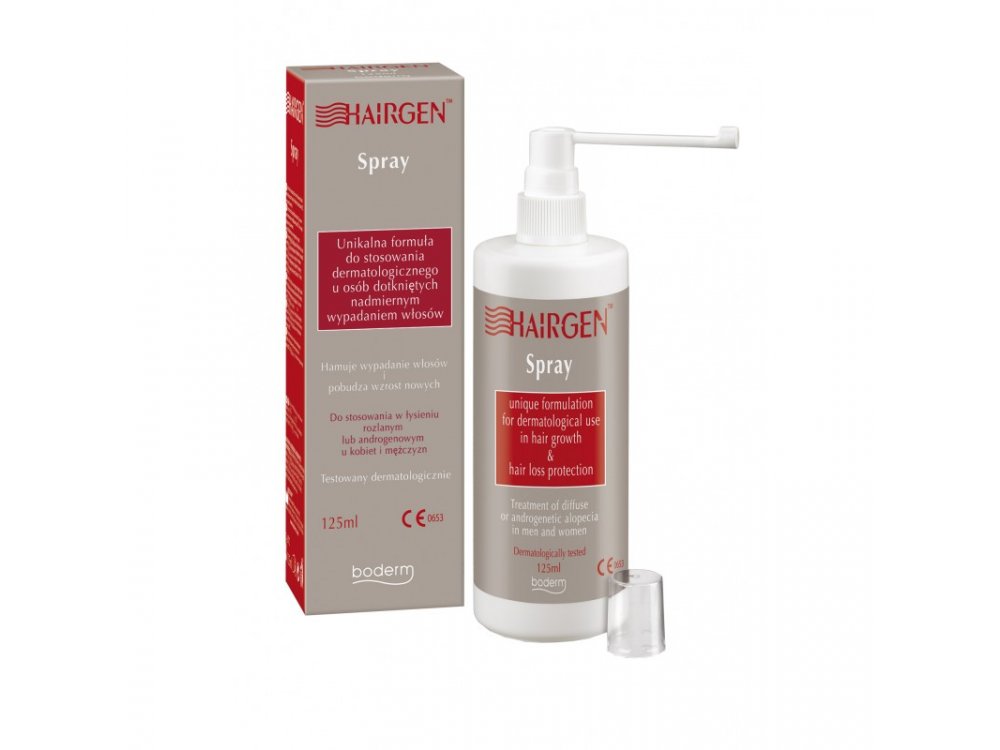 Hairgen Spray - Κατά της τριχόπτωσης (125ml) Το Hairgen Spray της Boderm δρα στους θύλακες των τριχών και αντιμετωπίζει την διάχυτη ή ανδρογενετική αλωπεκία σε άντρες και γυναίκες. Κύρια συστατικά & οφέλη Μelatonin, Saw Palmeto & Ginkgo Biloba: αναζωογονούν τα μαλλιά σταματώντας ή ελέγχοντας την τριχόπτωση, και διεγείροντας την ανάπτυξη νέων τριχών. Diaminopyrimidine oxide: συμβάλλει στην αύξηση του μεγέθους και του όγκου της τρίχας. Το Hairgen Spray της Boderm είναι δερματολογικά ελεγμένο ΣΥΜΒΟΥΛΕΣ ΕΦΑΡΜΟΓΗΣ Εφαρμόστε έως 6 ψεκασμούς Hairgen Spray της Boderm, 1-2 φορές την ημέρα σε στεγνά μαλλιά Μην ξεπλύνετε για τις επόμενες 2-3 ώρες.