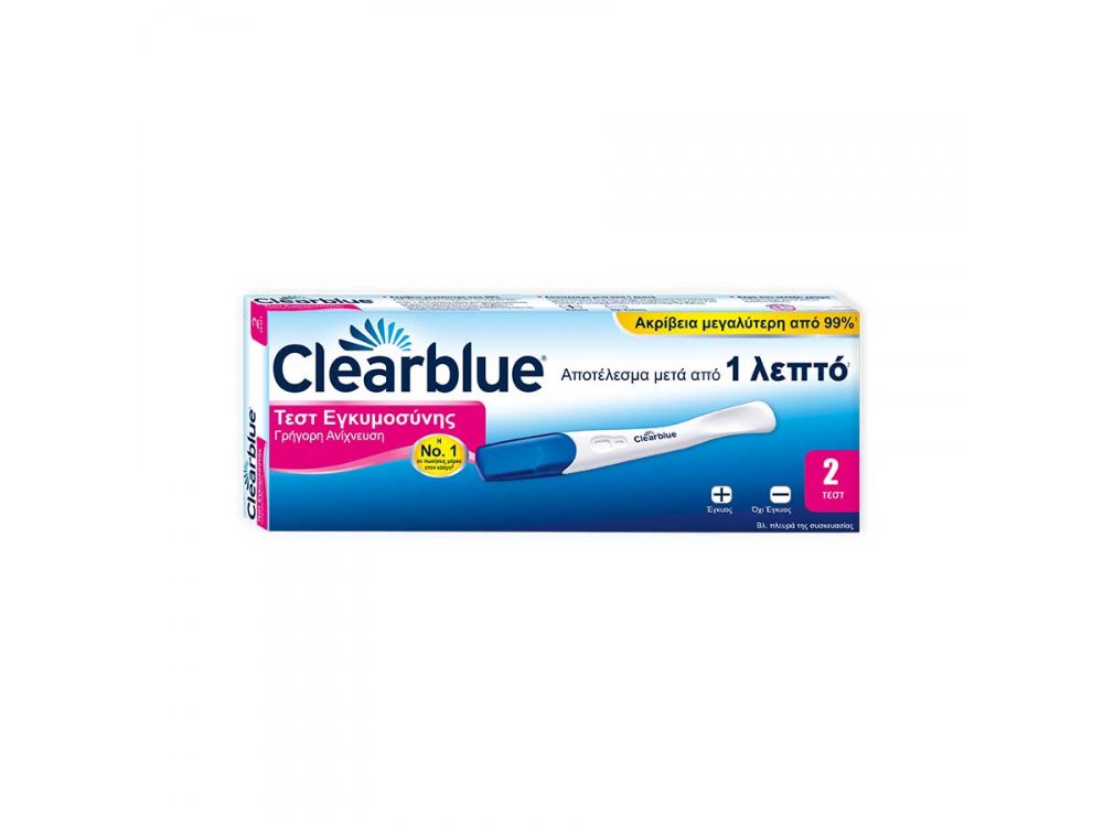 Το Διπλό Τεστ Εγκυμοσύνης Clearblue έχει σχεδιαστεί ώστε να σας προσφέρει την ευκολότερη εμπειρία τεστ εγκυμοσύνης, με την ακρίβεια που περιμένετε και αποτελέσματα σε μόλις 1 λεπτό. Ο επαναστατικός σχεδιασμός του είναι το αποτέλεσμα εκτεταμένης έρευνας στις γυναίκες και κέρδισε ακόμα και το βραβείο Red Dot Design το 2012. Το τεστ εγκυμοσύνης Clearblue παρέχει ακρίβεια πάνω από 99% από την αναμενόμενη ημέρα έναρξης της περιόδου. Είναι σχεδιασμένα για να είναι εύκολα στη χρήση και στην ανάγνωση, και μπορούν να χρησιμοποιηθούν έως και 5 ημέρες πριν από την καθυστέρησή. Οδηγίες χρήσης: Διαβάζετε πάντα το φύλλο οδηγιών προσεκτικά πριν κάνετε ένα τεστ εγκυμοσύνης.Εάν χρησιμοποιήσετε το τεστ από την πρώτη ημέρα καθυστέρησης, μπορείτε να το κάνετε με τα ούρα από οποιαδήποτε ώρα της ημέρας. Εάν κάνετε πρώιμο έλεγχο, χρησιμοποιήστε τα πρώτα πρωινά ούρα. 1.Όταν είστε έτοιμη να κάνετε το τεστ, αφαιρέστε το δοκιμαστικό στικ εγκυμοσύνης από το αλουμινένιο περιτύλιγμα και βγάλτε το μπλε καπάκι. Χρησιμοποιήστε το τεστ αμέσως. 2.Κρατήστε το απορροφητικό άκρο που αλλάζει χρώμα προς τα κάτω στη ροή των ούρων σας είτε σε ένα δείγμα των ούρων σας, σε ένα καθαρό στεγνό δοχείο, μόνο για 5 δευτερόλεπτα.Το άκρο που αλλάζει χρώμα θα γίνει γρήγορα ροζ, δείχνοντας ότι απορροφώνται ούρα. Συνεχίστε να κρατάτε το άκρο που αλλάζει χρώμα στα ούρα καθ' όλη τη διάρκεια των 5 δευτερολέπτων. 3.Περιμένετε για 3 λεπτά. Καθώς το τεστ εγκυμοσύνης αρχίζει να λειτουργεί, θα δείτε να σχηματίζονται γαλάζιες γραμμές.Μετά από 3 λεπτά μπορείτε να διαβάσετε τα αποτελέσματά σας στο παράθυρο αποτελέσματοςΌταν διαβάζετε το αποτέλεσμα, θα πρέπει να υπάρχει μια μπλε γραμμή στο παράθυρο ελέγχου. Αυτή η γραμμή υποδεικνύει ότι το τεστ έγινε με επιτυχία.