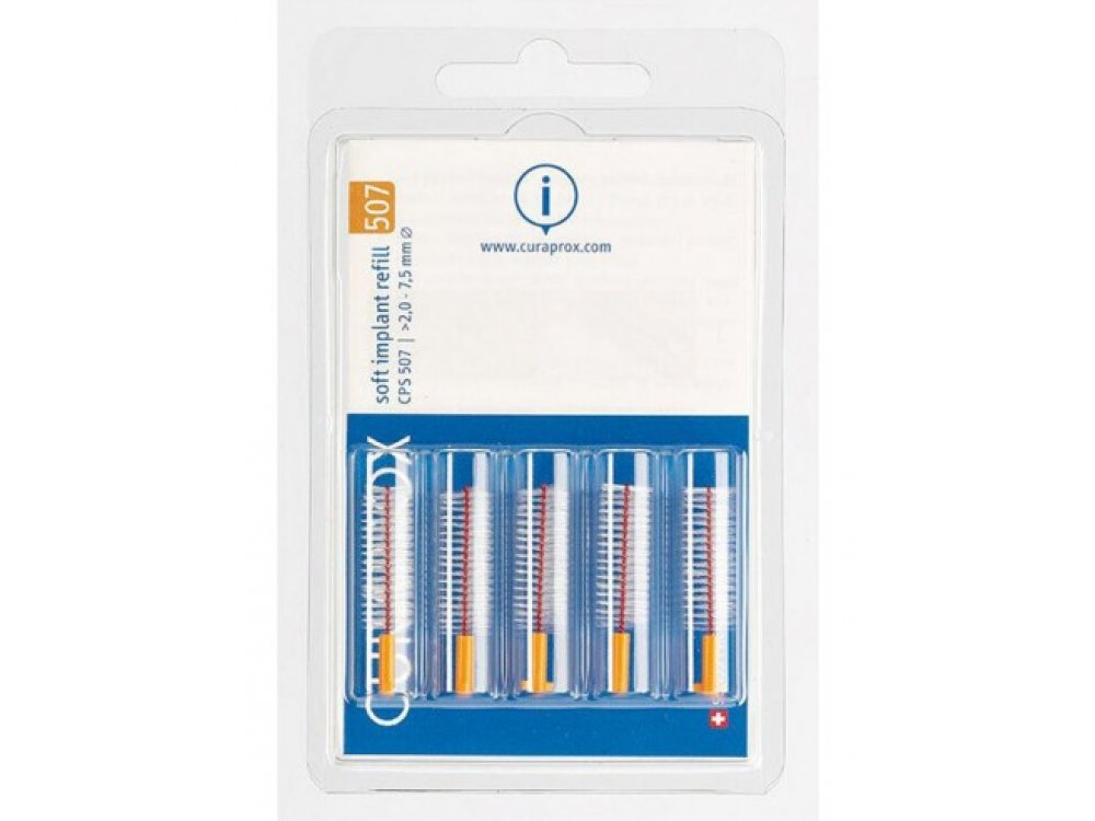Συσκευασία ανταλλακτικών με 5 μεσοδόντια βουρτσάκια CPS 507 soft implant (για εμφυτεύματα) Ειδικά σχεδιασμένα μεσοδόντια βουρτσάκια με λεπτές και μακριές ίνες, για απαλό καθαρισμό των μεγάλων διαστημάτων μετά από περιοδοντική θεραπεία και για τα εμφυτεύματα. Η σειρά CPS soft implant προορίζεται αποκλειστικά για τέτοιες περιπτώσεις. Προσβασιμότητα: >2,0 χλστ. / Αποτελεσματικότητα: 7,5 χλστ.