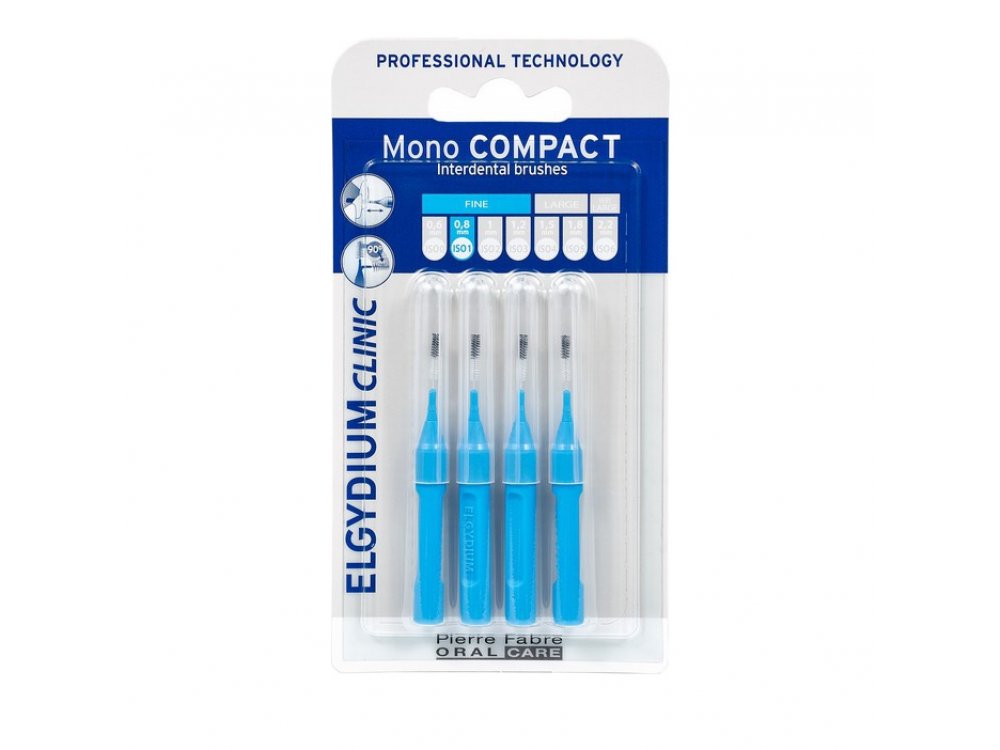 Ενδείξεις Τα μεσοδόντια βουρτσάκια ELGYDIUM Mono Compact ενδείκνυνται για τον ολοκληρωμένο καθαρισμό των μεσοδόντιων διαστημάτων. Ιδιότητες Τα μεσοδόντια βουρτσάκια ELGYDIUM Clinic Mono Compact ξεχωρίζουν για την ποιότητα κατασκευής και την ανθεκτικότητά τους. Κάθε μεσοδόντιο βουρτσάκι έχει προστατευτικό καπάκι για καλύτερη υγιεινή και μπορεί να χρησιμοποιηθεί και για επιμήκυνση του στελέχους. Είναι εργονομικά σχεδιασμένα για ευκολία και άνεση στη χρήση, ενώ το πολύ λεπτό τους στέλεχος δεν πληγώνει τα ούλα. Τα ELGYDIUM CLINIC Mono Compact κυκλοφορούν σε 6 μεγέθη για να διαλέξετε το μέγεθος που σας ταιριάζει.