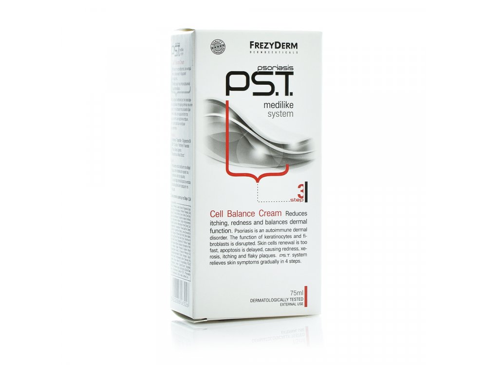 Tε?σσερα βη?ματα αγωγη?ς και φροντι?δας Frezyderm - PST Cell Balance cream Step3 75ml, Κατά της Ψωρίασης [SKU263026] Ρύθμιση πολλαπλασιασμού επιδερμικών κυττάρων, μείωση ερυθρότητας, πρόληψη και αναστροφή φλεγμονής. Η σειρά PS.T. είναι μια εξειδικευμένη αγωγή τεσσάρων βημάτων για την περιποίηση και ανακούφιση του ψωριασικού δέρματος καθώς και την αισθητική του βελτίωση. Αποτελείται από 4 εξειδικευμένα προϊόντα με βιομιμητική δράση και κοσμητολογικά χαρακτηριστικά που στοχεύουν στη βελτίωση της εμφάνισης και της εικόνας του δέρματος, της ψυχολογίας καθώς και της ποιότητας ζωής του ψωριασικού ασθενή. Είναι κατάλληλα σε περιόδους ύφεσης και έξαρσης και λειτουργούν αυτόνομα αλλά και σε συνδυασμό με όλες τις θεραπευτικές φαρμακευτικές αγωγές για την ψωρίαση. Δεν περιέχουν parabens. Εξειδικευμένη κρέμα με βιομιμητική δράση, που μειώνει την ερυθρότητα, τον κνησμό και ομαλοποιεί τη δερματική λειτουργία. Με τα ενεργά του συστατικά και τα φυσικά έλαια, ανακουφίζει και μειώνει τη φλεγμονή, ελαττώνει τον πολλαπλασιασμό των κυττάρων, ομαλοποιεί την ωρίμανση των κερατινοκυττάρων. Δεν μυρίζει και δεν λεκιάζει. Συνεργεί με τις φαρμακευτικές αγωγές. Δεν περιέχει parabens. Ενδείξεις: Ψωριασικό δέρμα, ερυθρό, λεπτό, ευαίσθητο, με φολίδες. Υπερκερατωσικές δερματοπάθειες Συνδυάζεται με όλα τα θεραπευτικά σχήματα. Χρήση: Καθημερινή τακτική χρήση. Απλώστε τη σε καθαρό δέρμα στην πάσχουσα περιοχή. Δράση - Ενεργά Συστατικά: Πρόληψη και αναστροφή σημείων νευρογενούς φλεγμονής (Palmitoyl Tripeptide) Ρύθμιση παραγωγής IL-1, IL-6, TNF-α (Oligopeptide, GPI-Choline) Αντιμιτωτική Δράση (Larrea Divaricata) Αντιοξειδωτική δράση _ Επούλωση (έλαιο ελάτης)