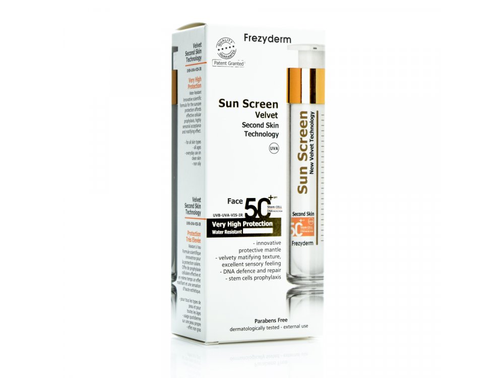 Αντιηλιακή κρέμα SPF50+με βελούδινη ματ υφή.Πολύ υψηλή προστασία.Ανθεκτικό στο νερό. Αόρατος αντιηλιακός μανδύας με βελούδινη ματ υφή εξαιρετικής αίσθησης,προστατεύει & διορθώνει το DNA των κυττάρων,θωρακίζει τα βλαστοκύτταρα του δέρματος