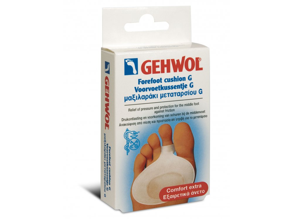 Gehwol Metatarsal Cushion G Large - Μαξιλαράκι μεταταρσίου G Μεγάλου μεγέθους Αντιπιεστικό και προστατευτικό επικάλυμμα πολυμερούς γέλης, τύπου G. Aνακούφιση στα μέτρα σας! Επικάλυμμα απο μαλακό, υψηλής ελαστικότητας υλικό, φιλικό στο δέρμα, που προστατεύει αποτελεσματικά την περιοχή του εμπρόσθιου τμήματος του πέλματος (μετατάρσιο) από τριβή και πίεση. Είναι ιδιαίτερα άνετο, καθώς αποτελείται από πολυμερή γέλη, με ειδική ενίσχυση στη μέση για καλύτερη απορρόφηση στην πίεση και τους κραδασμούς που προκαλούνται κατά τη διάρκεια του περπατήματος. Έχει τέλεια εφαρμογή στο σχήμα του ποδιού και των δακτύλων. Εφαρμόζει τέλεια στο πέλμα χωρίς να γλιστράει. Ενεργεί υποστηρικτικά σε θεραπείες, ενώ είναι ιδανικό για ρευματικούς ασθενείς. Ιατρικό βοήθημα. Δερματολογικά ελεγμένο. Διατίθεται σε δύο μεγέθη, Small & Large (Μικρό και μεγάλο). Σημαντικό: Σε κάθε περίπτωση που διαπιστώσετε σημάδια στο δέρμα ή στα νύχια, παραμορφώσεις των δακτύλων ή των νυχιών, επίμονους πόνους στα πόδια ή οτιδήποτε που κρίνετε ανησυχητικό, απευθυνθείτε σε ειδικό ιατρό, ποδολόγο, δερματολόγο ή ορθοπεδικό. Συσκευασία με 2 τεμάχια.