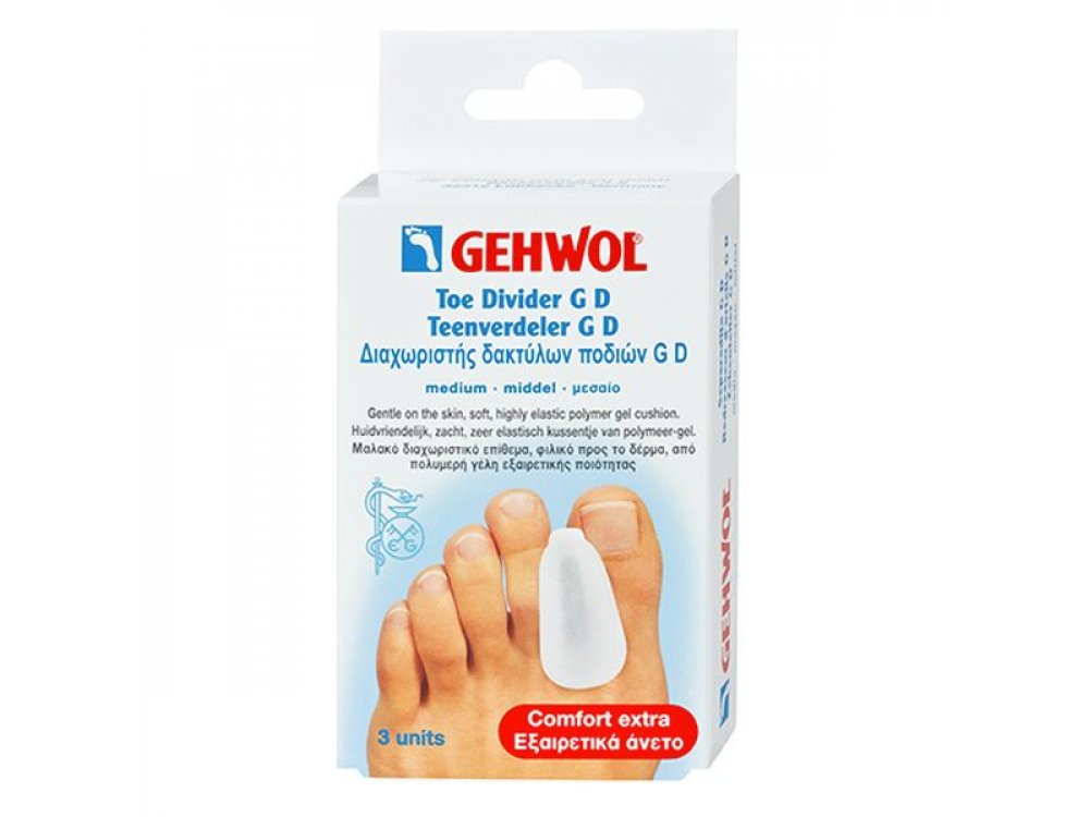 Ο Διαχωριστής δακτύλων ποδιού GD Gehwol έχει νέα βελτιωμένη ανατομική εφαρμογή, η οποία είναι απαλή για το δέρμα & διασφαλίζει μεγαλύτερη & πιο σταθερή στήριξη. Χάρη στην πολυμερή γέλη υψηλής ελαστικότητας προστατεύει τα δάκτυλα που εφάπτονται μεταξύ τους από την τριβή. Επαναφέρει στη σωστή θέση τα αλληλεπικαλυπτόμενα δάκτυλα (εφίππευση δακτύλων) & ενδείκνυται για την αντιμετώπιση παραμορφώσεων του μεταταρσίου. Επιβραδύνει & μειώνει αισθητά το πρόβλημα των μεγάλων δακτύλων του ποδιού (κότσια) διορθώνοντας τη θέση τους.