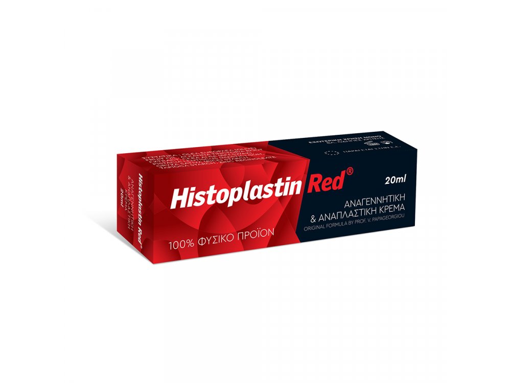 ΑΝΑΓΕΝΝΗΣΗ, ΑΝΑΠΛΑΣΗ & ΕΠΙΔΙΟΡΘΩΣΗ ΤΗΣ ΕΠΙΔΕΡΜΙΔΑΣ ΣΤΟ ΜΕΓΙΣΤΟ ΒΑΘΜΟ Το δερμοκαλλυντικό Histoplastin Red είναι Ελληνικό προϊόν με μοναδική, πατενταρισμένη διεθνώς σύσταση. Περιέχει το τριπλό φυτικό σύμπλεγμα 3Χ Complex με ισχυρές αναπλαστικές και επιδιορθωτικές ιδιότητες, διασπαρμένο σε παρθένο κίτρινο κηρό μελισσών. Το σύμπλεγμα 3Χ Complex είναι ιδανικός συνδυασμός από τρία φυσικά ισχυρά αντιοξειδωτικά, με παράλληλη επιδιορθωτική και αναπλαστική δράση, που λειτουργούν συνεργιστικά, θρέφουν εντατικά, ενυδατώνουν, τονώνουν και αναγεννούν σε βάθος το δέρμα. To σύμπλεγμα 3Χ Complex περιέχει: Αλκανίνες από τυποποιημένο εκχύλισμα της ρίζας του φυτού Alkanna tinctoria (Alkanna tinctoria root) Τερπενοειδή της ρητίνης Μαστίχα Χίου (Pistacia lentiscus var. Chia) Extra παρθένο ελαιόλαδο Το Histoplastin Red προορίζεται για εντατική περιποίηση των ανώτερων στοιβάδων του δέρματος. Αποκαθιστά γρήγορα και αποτελεσματικά όλα τα φυσιολογικά χαρακτηριστικά της νεανικής επιδερμίδας, όπως την όψη και την υφή. Ο συνδυασμός του 3Χ Complex με το κίτρινο κερί μέλισσας επιπλέον κατευνάζει ερεθισμούς. Πρόκειται για 100% φυσικό σύμπλεγμα, που αναπτύχθηκε αποκλειστικά με βάση τα επιστημονικά αποτελέσματα εκτενέστατης κλινικής έρευνας του καθηγητή και Επίτιμου Διδάκτορα της Ιατρικής Σχολής (Α.Π.Θ.), Βασίλη Παπαγεωργίου που χρονολογούνται από το 1978 και συνεχίζουν εώς και σήμερα. Δεν περιέχει κανένα χημικό έκδοχο ή άλλη συνθετική προσθετική ουσία, που συχνά ευθύνονται για ερεθισμό ή σημεία ευαισθησίας στο δέρμα. Η αναπλαστική ικανότητα της κρέμας έχει αποδειχθεί με μελέτες σε χρόνιες δερματικές αλλοιώσεις οποιασδήποτε αιτιολογίας, μη ανταποκρινόμενες σε θεραπεία, τόσο σε Ελληνικά όσο και σε ξένα Ινστιτούτα έρευνας (ενδεικτικά Νοσοκομείο Ανδρέας Συγγρός, Δερματολογική κλινική Heidberg Hospital, Hamburg). Έχει δικαίως καθιερωθεί ως _η θαυματουργή κόκκινη κρέμα_ χάρη στα θεαματικά αποτελέσματά της. Το Histoplastin Red είναι: Ισχυρός παράγοντας ανάπλ