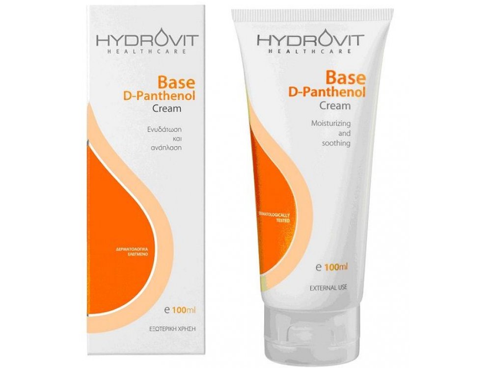 Η HYDROVIT BASE D-Panthenol Cream περιέχει 5% D-Panthenol (προβιταμίνη Β5) και Allantoin, που ενισχύουν την ενυδάτωση και την ανάπλαση του φυσιολογικού, ευαίσθητου, ατοπικού ή ερεθισμένου δέρματος. Τα συστατικά της προσφέρουν βαθιά ενυδάτωση, καταπραϋντική δράση και προστασία στην ξηρότητα και στους ερεθισμούς που προέρχονται από την έκθεση στο κρύο ή στον ήλιο και ανακουφίζουν το τραχύ και καταπονημένο δέρμα από τον κνησμό και τους ερεθισμούς. Καθημερινή χρήση: στη βρεφική φροντίδα, στην περίοδο της εγκυμοσύνης και γαλουχίας (ραγάδες), μετά την ηλιοθεραπεία, μετά το ξύρισμα. 100ml