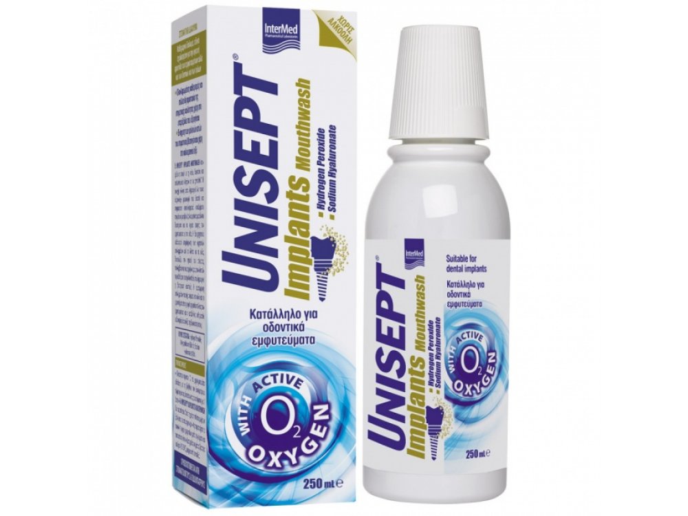 Το UNISEPT IMPLANT MOUTHWASH είναι ένα ειδικά σχεδιασμένο καθημερινό διάλυμα. Προορίζεται για χρήση από άτομα με οδοντικά εμφυτεύματα και βοηθά στην καθημερινή αντιμικροβιακή προστασία της στοματικής κοιλότητας. Προάγει την επούλωση των ιστών, μετά από διαδικασίες τοποθέτησης εμφυτευμάτων, αλλά και στη μετέπειτα συντήρησή τους, συμβάλλοντας στην καθαριότητα της περιοχής γύρω από αυτά. Αποτελεσματική απομάκρυνση της ουλοοδοντικής μικροβιακής πλάκας και πρόληψη του σχηματισμού της. Χωρίς φθόριο, δεν συμβάλλει στην οξείδωση των εμφυτευμάτων. Συσκευασία: 250ml Καθημερινή φροντίδα και προστασία των οδοντικών εμφυτευμάτων και ολόκληρης της στοματικής κοιλότητας ΥΠΕΡΟΞΕΙΔΙΟ ΥΔΡΟΓΟΝΟΥ 0,8% ΥΑΛΟΥΡΟΝΙΚΟ ΟΞΥ 0,05% CPC 0,05%