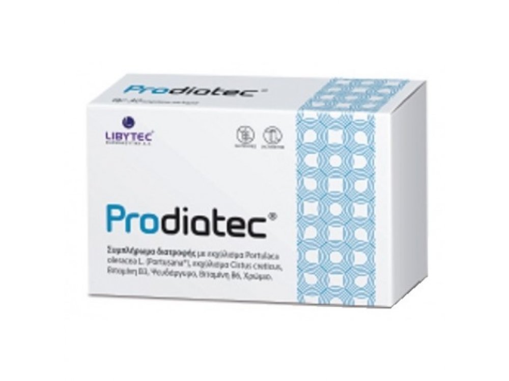 Libytec Prodiatec φυτικό συμπλήρωμα με γλιστρίδα & λαδανιά 30 κάψουλες Τo Prodiatec είναι συμπλήρωμα διατροφής που συνδυάζει δύο φυτικά εκχυλίσματα, μαζί με βιταμίνες και ιχνοστοιχεία. Περιέχει το μοναδικό πατενταρισμένο εκχύλισμα Portusana, από γλιστρίδα. Περιέχει εκχύλισμα λαδανιάς (Cistus creticus), ενός Ελληνικού φυτού. Ενισχύεται περαιτέρω για συνεργική δράση με τα ιχνοστοιχεία Cr, Zn και τις βιταμίνες B3 και B6. Σύμφωνα με τον κατάλογο των επιτρεπόμενων ισχυρισμών υγείας το χρώμιο συμβάλλει στη διατήρηση των φυσιολογικών επίπεδων γλυκόζης στο αίμα, παράλληλα με τη δράση του ψευδαργύρου που συμβάλει στο φυσιολογικό μεταβολισμό των υδατανθράκων. Οι βιταμίνες B3 και B6 αποτελούν επίσης σημαντικά συστατικά, συμβάλλοντας στη φυσιολογική λειτουργία των μεταβολικών διεργασιών που αποσκοπούν στην παραγωγή ενέργειας. Η βιταμίνη Β6 συμβάλλει στο φυσιολογικό μεταβολισμό των πρωτεϊνών και του γλυκογόνου. Δεν περιέχει γλουτένη και λακτόζη. Συνιστώμενη δοσολογία: Μία κάψουλα την ημέρα, πριν από το κύριο γεύμα.