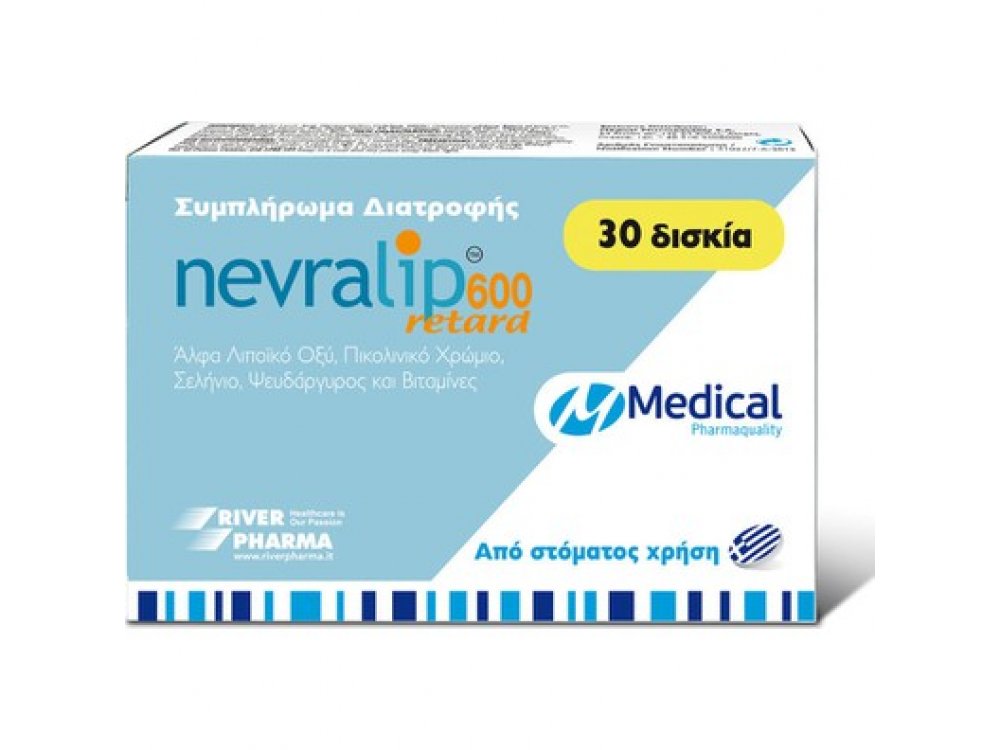 Συμπλήρωμα διατροφής με άλφα λιποϊκό οξύ, χρώμιο, σελήνιο, ψευδάργυρο & βιταμίνες Το Nevralip 600 retard είναι ένα συμπλήρωμα διατροφής με ειδική αντιοξειδωτική και νευροτροφική δράση που περιέχει Άλφα Λιποϊκό οξύ, Πικολινικό Χρώμιο, Σελήνιο, Ψευδάργυρο και Βιταμίνες που χρησιμεύουν στην αντιμετώπιση της μεταβλητής νευροτροφικής λειτουργίας και του οξειδωτικού στρες. Το Nevralip 600 retard έχει παρασκευαστεί με μία ειδική σύνθεση η οποία επιτρέπει την παρατεταμένη αποδέσμευση των συστατικών του προκειμένου να ξεπεραστεί ο περιορισμός που συνήθως σχετίζεται με τη χρήση του Άλφα Λιποϊκού Οξέος λόγω του μικρού χρόνου ημίσειας ζωής (περίπου 30 λεπτά). ΚΥΡΙΑ ΧΑΡΑΚΤΗΡΙΣΤΙΚΑ: Το Άλφα Λιποϊκό Οξύ είναι μία ουσία που συνήθως βρίσκεται σε ζωικούς και φυτικούς ιστούς. Ως ισχυρό αντιοξειδωτικό, διατηρεί την δραστικότητα του στο υδατικό περιβάλλον του κυττάρου αλλά και στα λιπιδικά τμήματα της μεμβράνης. Έχει την ικανότητα να αναγεννά οξειδωμένες μορφές Βιταμίνης C, Βιταμίνης Ε, Συνενζύμου Q10 και Γλουταθειόνης και επομένως δημιουργεί ένα αντιοξειδωτικό πλέγμα το οποίο είναι σημαντικό για την σωστή λειτουργία των κυτταρικών διαδικασιών. Ως συμπαράγοντας, συμμετέχει σε πλήθος ενζυμικών διαδικασιών που αποσκοπούν στην μετατροπή της Γλυκόζης και των λιπαρών οξέων σε ATP και επομένως σε ζωτική ενέργεια. Σταθεροποιεί τα επίπεδα της γλυκόζης στο αίμα, βελτιώνοντας τη μεταφορά της Γλυκόζης μεταξύ των κυττάρων και μειώνοντας τη διαδικασία Γλυκοζυλίωσης η οποία επιταχύνει την εκφύλιση και τη γήρανση των κυττάρων. Σύμφωνα με την επιστημονική βιβλιογραφία, το Άλφα Λιποϊκό οξύ έχει διπλή δράση: Δρα ως αντιοξειδωτικό περιορίζοντας τη βλάβη που προκαλείται από τις ελεύθερες ρίζες και βελτιώνει την ταχύτητα επικοινωνίας των νευρικών κυττάρων Σταθεροποιεί την ευαισθησία των νευρικών κυττάρων, μειώνοντας έτσι τον πόνο και το μούδιασμα Το Πικολινικό Χρώμιο είναι οργανική ένωση του Χρωμίου, βιολογικά ενεργή, η οποία βοηθά στη μείωση και τη σταθεροποίηση των επιπέδων γλυκόζης στο αίμα. Επιστημονική έρευνα απέδειξε ότι τα συμπληρώματα διατροφής με βιολογικά ενεργό Χρώμιο, βοηθούν στη διατήρηση του ελέγχου του γλυκαιμικού δείκτη, της χοληστερόλης και των επιπέδων τριγλυκεριδίων στο αίμα. Το Σελήνιο και ο Ψευδάργυρος είναι βασικά μέταλλα και συμμετέχουν στη βιοσύνθεση ενός αριθμού ενζύμων με αντιοξειδωτικές ιδιότητες. Το σύμπλεγμα βιταμινών Β, συγκεκριμένα η βιταμίνη Β1 (Θειαμίνη), είναι επίσης γνωστή ως βιταμίνη κατά της νευρίτιδας, προστατεύοντας τα νεύρα από τα φαινόμενα εκφυλισμού. Η παρουσία της Βιοτίνης είναι χρήσιμη αφού η παρατεταμένη χορήγηση Άλφα Λιποϊκού οξέος μπορεί να αλληλεπιδράσει στην ενδογενή βιοσύνθεση της Βιοτίνης. Συνιστώμενη δόση: Η συνιστώμενη δόση είναι 1 δισκίο ημερησίως, λαμβάνεται με άφθονο νερό ή χυμό φρούτων κατά προτίμηση με άδειο στομάχι. Η παρουσία τροφής μπορεί να μειώσει σημαντικά την βιοδιαθεσιμότητα του Άλφα Λιποϊκού Οξέος (έως και 30%). Δείτε επίσης: Nevralip 600 Retard Συμπλήρωμα Διατροφής 20 tabs