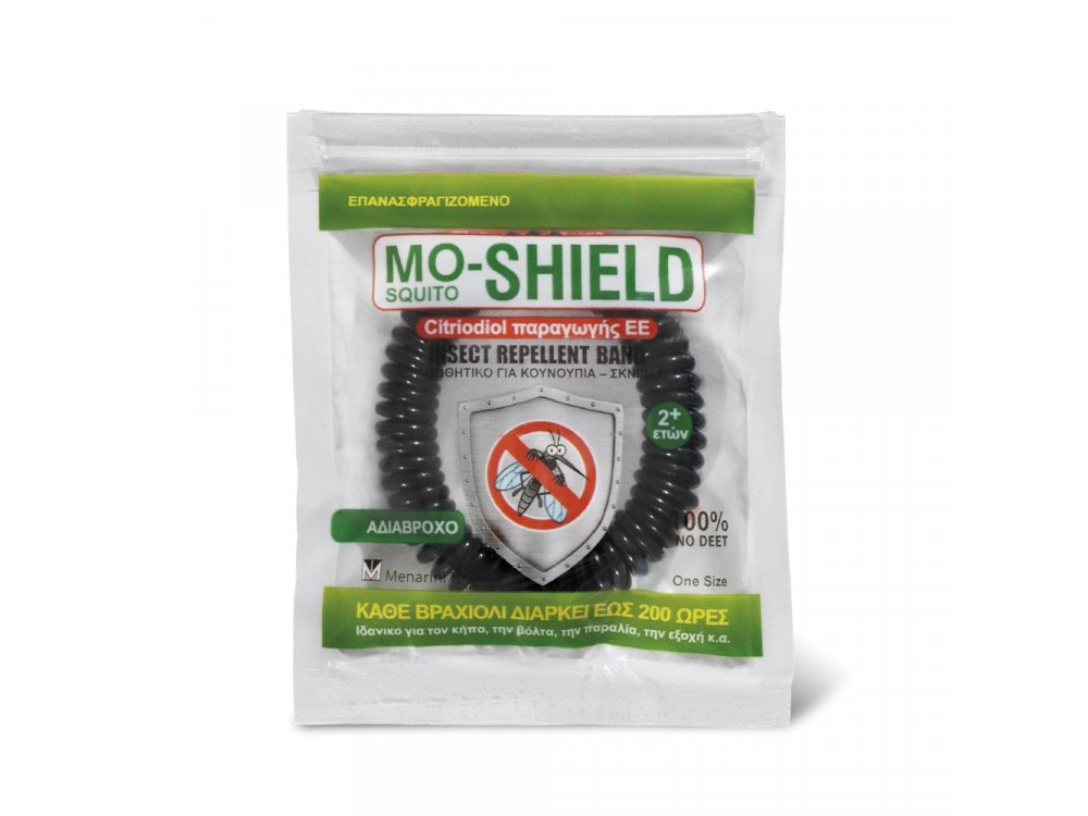 Το εντομοαπωθητικό - αντικουνουπικό βραχιολάκι Mo-Shield Band, είναι μια ασπίδα προστασίας κατά των κουνουπιών. Προστατεύει από κουνούπια, σκνίπες, τσιμπούρια και ψύλλους. Αποτελεσματικό και για το κουνούπι Τίγρης Είναι αδιάβροχο και διαρκεί έως και 200 ώρες. Για παράταση της δράσης του να τοποθετείται το βραχιόλι στην επανασφραγιζόμενη συσκευασία του, όταν δεν χρησιμοποιείται. Ιδανικό για τον κήπο, τη βόλτα, την παραλία, την εξοχή κ.α. Χρήση: Απλα φορέστε το βραχιολάκι στον καρπό σας ή στον αστράγαλο. Η εφαρμογή στα παιδιά γίνεται υπό την επίβλεψη ενήλικα. Εναλλακτικά τοποθετήστε το βραχιόλι σε σημείο του χώρου που θέλετε να προστατέψετε και που να μην είναι προσβάσιμο από μικρά παιδιά. Προφυλάξεις: Αποφύγετε την επαφή μετα μάτια και το στόμα. Απαιτείται γονική επίβλεψη για παιδιά άνω των 2 ετών. Να μην εφαρμόζεται σε παιδιά κάτω των 2 ετών. Σε περίπτωση επαφής με τα μάτια πλύνετε τα αμέσως με άφθονο νερό ή ζητήστε ιατρική συμβουλή Σε περίπτωση κατάποσης ζητήστε αμέσως ιατρική συμβουλή και δείξτε την ετικέτα