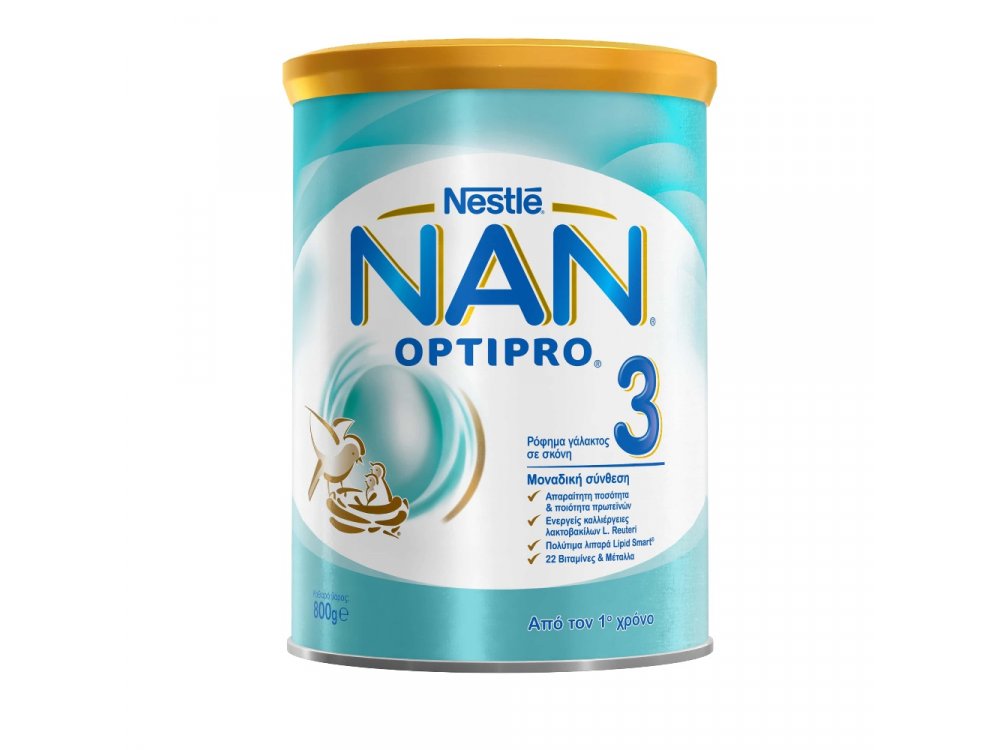 Το NAN OPTIPRO 3 είναι ένα ρόφημα γάλακτος για παιδιά από 1 έτους και πάνω ως το γαλακτούχο στοιχείο της διατροφής τους. Ο μοναδικός και συμπληρωματικός συνδυασμός υψηλής ποιότητας θρεπτικών συστατικών, απαραίτητων στη δίαιτα των παιδιών αυτής της ηλικία,συμβάλλει στη σωστή ανάπτυξη. -OPTIPRO, ένα μοναδικό μίγμα πρωτεινών που προσφέρει την απαραίτητη ποσότητα και ποιότητα πρωτεινών για την ηλικία του παιδιού σου. -Ενεργείς καλλιέργειες L. Reuteri που φυσιολογικά υπάρχουν στην εντερική χλωρίδα των βρεφών. - Μίγμα πολύτιμών λιπαρών Lipid Smart ειδικά προσαρμοσμένο στις ανάγκες των παιδιών αυτής της ηλικίας. ΣΗΜΑΝΤΙΚΗ ΥΠΕΝΘΥΜΙΣΗ: Το μητρικό γάλα είναι η ιδανική τρόφη για τα βρέφη και ο μητρικός θηλασμός πρέπει να συνεχίζεται όσο το δυνατόν περισσότερο. Πριν αποφασίσετε να χρησιμοποιήσετε ένα βρεφικό γάλα, ζητήστε τη συμβουλή του παιδιάτρου σας.