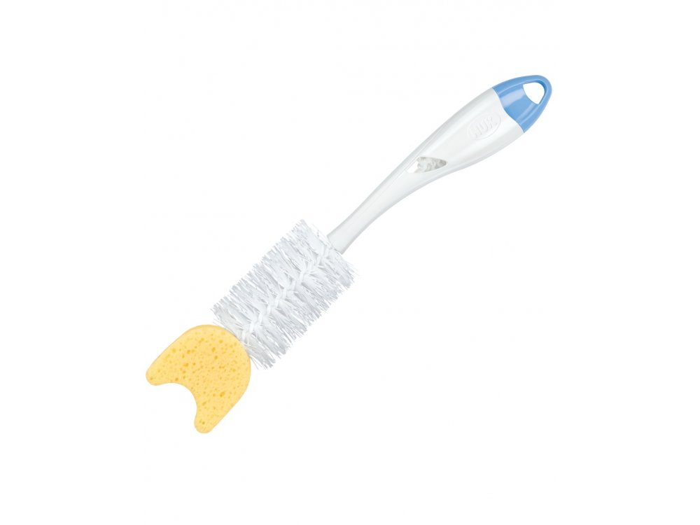 Απλά αποτελεσματικό: για τον βέλτιστο καθαρισμό των μπιμπερό και των θηλών. Βούρτσα μπιμπερό με εργονομική λαβή, σε διάφορους συνδυασμούς χρωμάτων που ταιριάζουν με τα προϊόντα της NUK. Όλα πεντακάθαρα και υγιεινά: βουρτσάκι με εύκαμπτες, ανθεκτικές τρίχες και συμπληρωματικό σφουγγαράκι για τον σχολαστικό καθαρισμό του πυθμένα των μπιμπερό, καθώς και των πιο δυσπρόσιτων σημείων. Καθαριστική ισχύς εν τη ενώσει _ το σύστημα 2 σε 1: το βουρτσάκι για θηλές κουμπώνει απευθείας στη λαβή της βούρτσας μπιμπερό, ώστε να μην το χάνετε πια. Με οπή αερισμού στη λαβή της βούρτσας για να στεγνώνει γρήγορα το βουρτσάκι για τις θηλές και ειδικό γάντζο στο άκρο της λαβής για μπορείτε να κρεμάτε τη βούρτσα. Σε διάφορα χρώματα 0 m+ Απαλός καθαρισμός - με αγάπη και υπευθυνότητα Η βούρτσα μπιμπερό 2 σε 1 με σφουγγαράκι της NUK αποτελεί τον τέλειο συνδυασμό βούρτσας και σφουγγαριού. Το σφουγγαράκι εφαρμόζει εύκολα και καθαρίζει σχολαστικά ακόμη και τα πιο δυσπρόσιτα σημεία, όπως τον πυθμένα του μπιμπερό και τις γωνίες. Διαθέτει ενσωματωμένο βουρτσάκι για θηλές που κουμπώνει στη λαβή. Η εργονομική λαβή σάς επιτρέπει να ασκείτε μεγαλύτερη πίεση όσο καθαρίζετε και εξασφαλίζει βέλτιστο κράτημα. Περαιτέρω συμβουλές: Για τον ήπιο αλλά αποτελεσματικό καθαρισμό των μπιμπερό και των θηλών, μπορείτε να χρησιμοποιείτε τα ειδικά προϊόντα καθαρισμού της NUK: NUK Υγρό καθαρισμού για μπιμπερό και θηλές _ ήπιο καθαριστικό με συστατικά βασισμένα στη φύση για βρεφικά προϊόντα. NUK Σφουγγαράκι καθαρισμού θηλών - για τον τέλειο καθαρισμό των θηλών με φαρδύ λαιμό. NUK Vapo-Rapid _ υγιεινός καθαρισμός μέσω αποστείρωσης με ατμό.