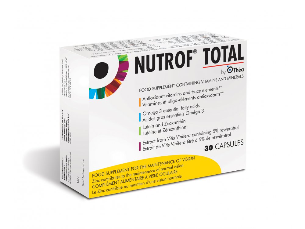 Ό,τι χρειάζεται ο ασθενής με ΗΕΩ, στις σωστές ποσότητες, σε μία μόνο κάψουλα. Το Nutrof? Total είναι ένα συμπλήρωμα διατροφής για οφθαλμικές παθήσεις, που αναπτύχθηκε από διαιτολόγους και οφθαλμιάτρους που ειδικεύονται στον αμφιβληστροειδή. Η σύνθεση του Nutrof? Τotal παρέχει στους ασθενείς με ΗΕΩ (Ηλικιακή Εκφύλιση της Ωχράς) αντιοξειδωτικά, χρωστικές της ωχράς κηλίδας και ωμέγα-3 λιπαρά οξέα ώστε να συμπληρώσουν τις ελλείψεις τους από την διατροφή. Γενικά: Ένα από τα σημαντικότερα αισθητήρια όργανα του ανθρώπινου σώματος είναι ο οφθαλμός ο ποιος είναι συνεχώς εκτεθειμένος στο φως. Το φως του ήλιου και ειδικά οι ακτινοβολίες UV σε συνδυασμό με το οξυγόνο παράγουν ελεύθερες ρίζες οι οποίες προκαλούν κυτταρικές βλάβες και εκφυλιστικές αλλοιώσεις. Τα αντιοξειδωτικά που υπάρχουν στους ιστούς, προστατεύουν από τις ελεύθερες ρίζες και το οξειδωτικό Stress. Μια από τις πιο συχνές εκφυλιστικές ασθένειες του οφθαλμού, που οφείλετε στο οξειδωτικό Stress, είναι η Ηλικιακή Εκφύλιση της Ωχράς Ξηρού τύπου (ξηρή ΗΕΩ). Μέχρι στιγμής δεν υπάρχει θεραπεία ή χειρουργική αντιμετώπιση της ΗΕΩ ξηρού τύπου. Για να μειωθεί ο κίνδυνος εμφάνισης ΗΕΩ ή να μειωθεί ο ρυθμός εξέλιξης της νόσου είναι απαραίτητο να λειτουργεί ο προστατευτικός μηχανισμός του σώματος και να ενισχυθεί από βιταμίνες αντιοξειδωτικά και ένζυμα όπως αναφέρει η μελέτη AREDS. Απαραίτητα συστατικά για προστασία από την ΗΕΩ: Η μελέτη AREDS έδειξε ότι η λήψη αντιοξειδωτικών βιταμινών και μετάλλων μειώνει: - Τον κίνδυνο εξέλιξης της ΗΕΩ κατά 25% - Τον κίνδυνο απώλειας της οπτικής οξύτητας κατά 19% Η Ρεσβερατρόλη είναι μία ισχυρά αντιοξειδωτική, αντιαγγειογεννετική και αντιφλεγμονώδης ουσία που υπάρχει στα κόκκινα σταφύλια. Η τακτική λήψη Ρεσβερατρόλης μειώνει την πιθανότητα εξέλιξης της ΗΕΩ κατά 40%. Οι χρωστικές της ωχράς (Λουτε?νη και Ζεαξανθίνη) βρίσκονται στον αμφιβληστροειδή και απορροφούν την βλαβερή υπεριώδη ακτινοβολία. Η συγκέντρωση της Λουτε?νης και της Ζεαξανθίνης μειώνεται με την πάροδο της ηλικίας με συνέπεια η ωχρά κηλίδα να είναι εκτεθειμένη στην UV ακτινοβολία και τις ελεύθερες ρίζες. Η μελέτη Carma αναφέρει ότι η ημερήσια πρόσληψη Λουτε?νης και Ζεαξανθίνης μαζί με αντιοξειδωτικά μειώνει την μορφολογική εξέλιξη της ΗΕΩ. Επίσης η μελέτη LAST έδειξε ότι η ημερήσια πρόσληψη 10mg λουτε?νης για 12 μήνες βελτίωσε την οπτική οξύτητα και την ανάκαμψη από το θάμβος. Τα Ωμέγα-3 λιπαρά οξέα αποτελούν σημαντικά συστατικά στην δομή και την λειτουργία του αμφιβληστροειδούς. Μελέτες έδειξαν ότι η υψηλή πρόσληψη Ωμέγα-3 λιπαρών οξέων μείωσε την πιθανότητα για ΗΕΩ έως και 38%. Όλα τα παραπάνω είναι απαραίτητα συστατικά για την λειτουργία του οφθαλμού και δεν παράγονται από τον ανθρώπινο οργανισμό επομένως η πρόσληψη πρέπει να γίνεται μονό μέσω των τροφών. Επιπλέον οι ασθενείς με ΗΕΩ πρέπει να λαμβάνουν συμπληρώματα διατροφής με αντιοξειδωτικές βιταμίνες και μέταλλα, χρωστικές της ωχράς, ωμέγα-3 λιπαρών οξέων και άλλων θρεπτικών συστατικών. Το Nutrof? Total παρέχει στον ασθενή τα απαραίτητα συστατικά στις σωστές ποσότητες σε μόνο μία κάψουλά. Κουτί με 30 μαλακές κάψουλες, καθαρού βάρους 24,3g