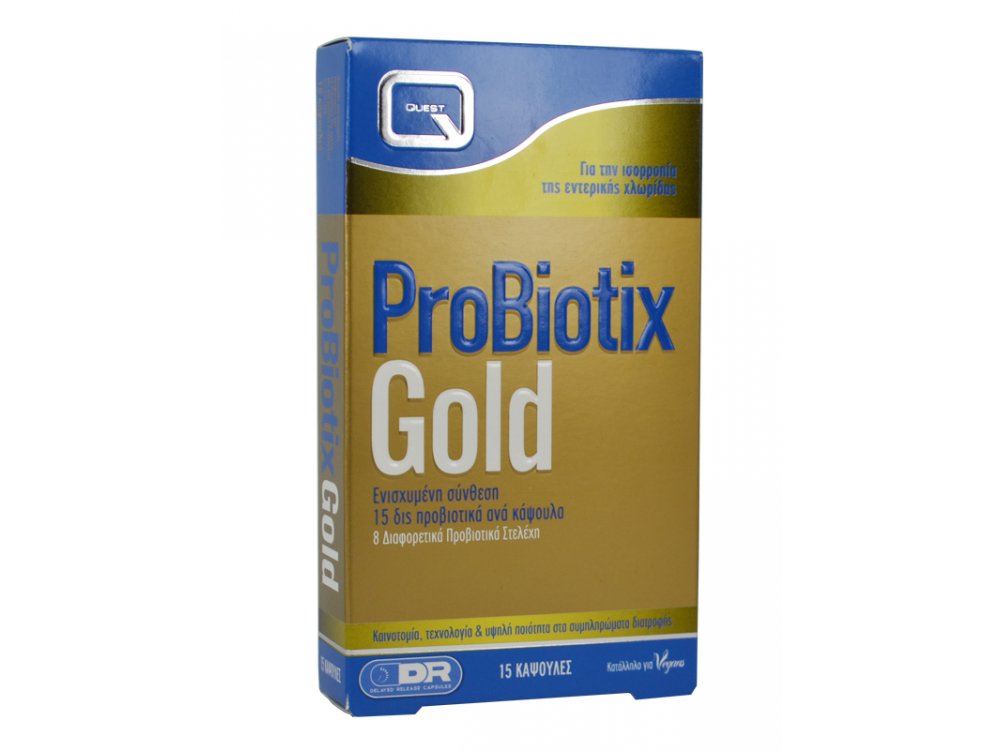 Το ProBiotix Gold της Quest συνδυάζει 8 διαφορετικά προβιοτικά, τα L.acidophilus, L.rhamnosus, L.casei, L.plantarum, L.paraplantarum, L.bulgaricus, L.gasseri και L.fermentum. Κάθε κάψουλα ProBiotix Gold αποδίδει 15 δισεκατομμύρια προβιοτικά, τα οποία συμβάλλουν στην ισορροπία της εντερικής χλωρίδας, την καλή λειτουργία του εντέρου και την αποφυγή γαστρεντερικών διαταραχών, όπως δυσκοιλιότητας ή διάρροιας. Λόγω της ενισχυμένης του σύνθεσης, το ProBiotix Gold είναι ιδανικό και για περιόδους που λα