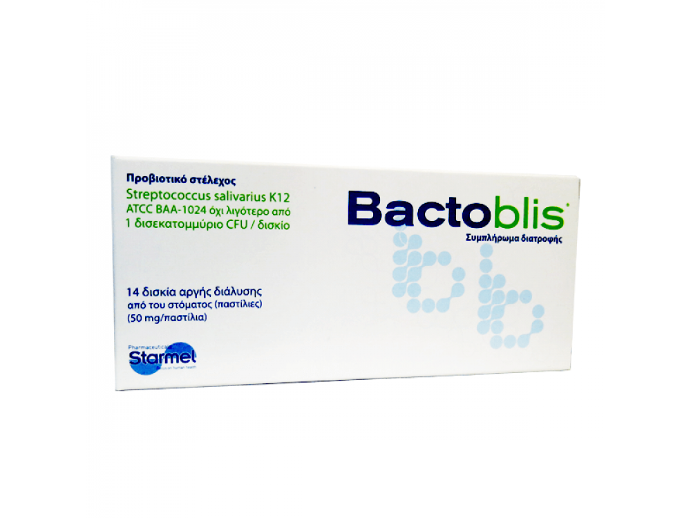 Δισκία αργής διάλυσης από του στόματος (παστίλιες) [50mg/παστίλια] Συμπλήρωμα διατροφής που περιέχει ένα προβιοτικό στέλεχος Streptococcus salivarius K12. Χρήσιμο για την ισορροπία της χλωρίδας της στοματικής κοιλότητας. Μέση περιεκτικότητα ανά δισκίο: Streptococcus salivarius BLIS K12* -> 1 δισεκατομμύριο CFU Βιώσιμα κύτταρα** **Η περιεκτικότητα σε ζωντανά κύτταρα, αναφέρεται σε προϊόν σωστά αποθηκευμένο. *Blis K12 είναι σήμα κατατεθέν Τρόπος Χρήσης Προτείνεται να λιώσετε στο στόμα, αργά και έως την πλήρη απορρόφησή της, 1 παστίλια των 50mg το 24ωρο, κατά προτίμηση το βρ'αδυ, πριν τον ύπνο.