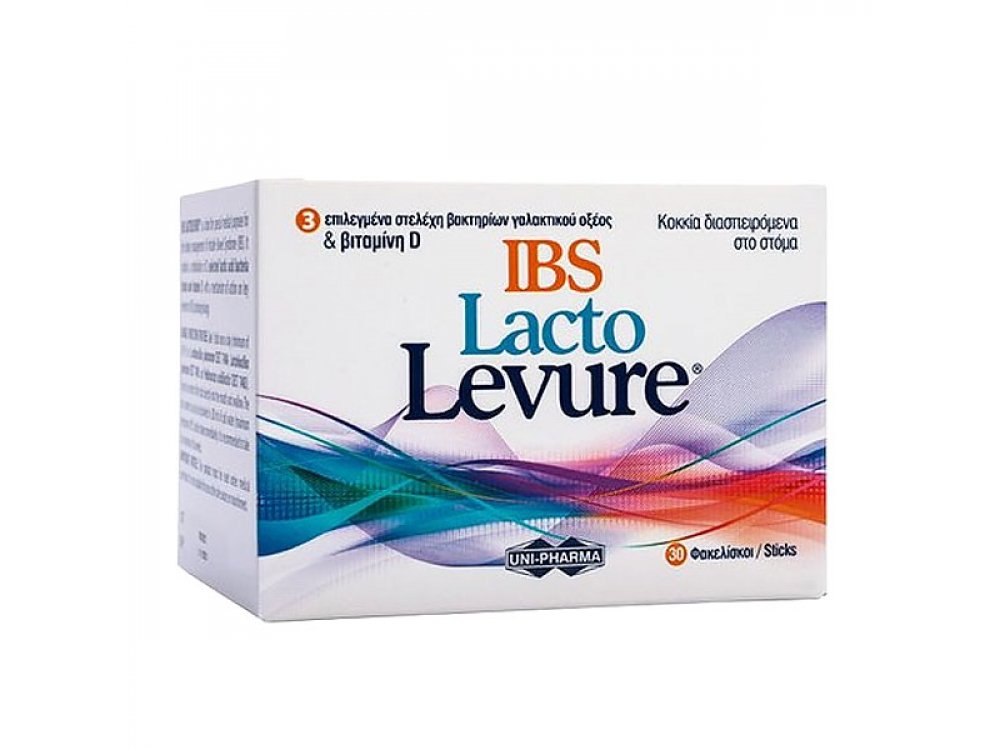 UniPharma Lacto Levure IBS Συμπλήρωμα Προβιοτικών για Άτομα με Σύνδρομο Ευερέθιστου Εντέρου Το IBS LACTOLEVURE? είναι συμπλήρωμα διατροφής για ειδικούς ιατρικούς σκοπούς, όπως για τη διαιτητική αγωγή ατόμων με Σύνδρομο Ευερέθιστου Εντέρου (ΣΕΕ). Περιέχει 3 επιλεγμένα στελέχη βακτηρίων γαλακτικού οξέος & βιταμίνη D, με μηχανισμό δράσης σε βασικά στοιχεία της παθοφυσιολογίας του ΣΕΕ μείωση της εντερικής διαπερατότητας, διόρθωση της εντερικής μικροβιακής δυσβίωσης, μείωση της φλεγμονής και της εντερικής υπερευαισθησίας. Βοηθά στη βελτίωση της ποιότητας ζωής και τη μείωση του άγχους που συνδέεται με την κατάσταση του εντέρου. Η αποτελεσματικότητά του σε ασθενείς με ΣΕΕ έχει αποδειχθεί σε κλινική μελέτη (Lorenzo-Zu?iga, V., et al. World J Gastroenterology, 2014. 20: 8709-16) και η ανεπάρκεια βιταμίνης D έχει επανειλημμένα συνδεθεί με υψηλότερο κίνδυνο εμφάνισης ΣΕΕ και μείωση της ποιότητας ζωής ασθενών με ΣΕΕ. ΧΡΗΣΗ 1 Φακελίσκος μία φορά την ημέρα. Αδειάστε το περιεχόμενο κατευθείαν στο στόμα και καταπιείτε, ή διαλύστε το περιεχόμενο σε 200ml κρύου νερού και πιείτε το αμέσως. Συστήνεται η λήψη για τουλάχιστον 6 εβδομάδες. ΜΟΡΦΗ Κοκκία διασπειρόμενα στο στόμα