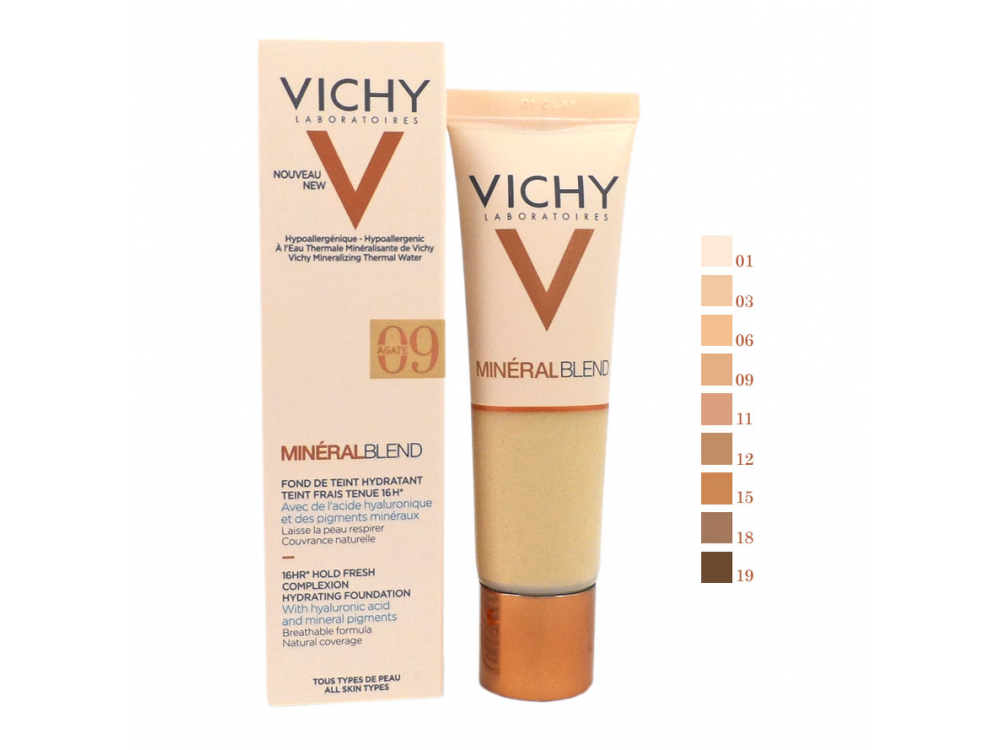 Vichy MineralBlend Hydrating Foundation 09 Agate Ενυδατικό Fond de Teint 16 ωρών. Η εξαιρετικά ελαφριά του σύνθεση εμπλουτίζεται με ενεργά συστατικά dermocosmetic: Ιαματικό Νερό Vichy, υαλουρονικό οξύ φυσικής προέλευσης και φυσικές χρωστικές ουσίες. Κατά την εφαρμογή, απλώνεται ομοιόμορφα στην επιδερμίδα χωρίς αποτέλεσμα μάσκας. Το δέρμα αναπνέει όλη την ημέρα και αφήνει λαμπερή την επιδερμίδα για 16 ώρες. Μέρα με τη μέρα, το δέρμα είναι ορατά πιο φωτεινό και τα σημάδια της κόπωσης ξεθωριάζουν. Εξαιρετικά ενυδατική φόρμουλα Διάρκεια 16 ωρών Ομοιόμορφο αποτέλεσμα Συστατικά: Φυσικές χρωστικές, Viney Mineralizing Water, Υαλουρονικό οξύ φυσικής προέλευσης Τύπος δέρματος: Όλοι οι τύποι δέρματος Πότε: Όλη μέρα Οφέλη: Αφήνει την επιδερμίδα να αναπνέει. Κάλυψη: Ενδιάμεση κάλυψη Συσκευασία: 30ml