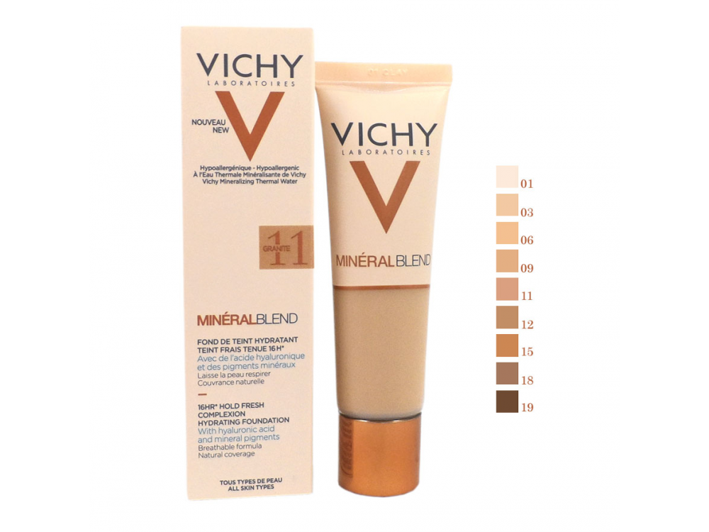 Ενυδατικό Fond de Teint 16 ωρών. Η εξαιρετικά ελαφριά του σύνθεση εμπλουτίζεται με ενεργά συστατικά dermocosmetic: Ιαματικό Νερό Vichy, υαλουρονικό οξύ φυσικής προέλευσης και φυσικές χρωστικές ουσίες.
