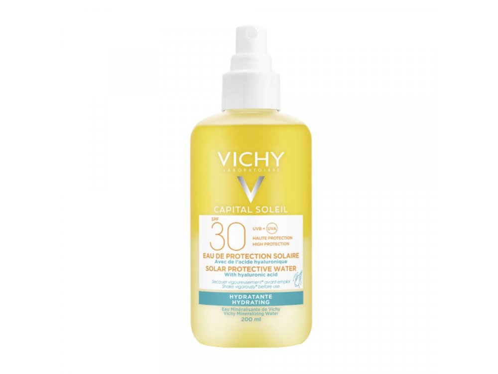 Αντηλιακό νερό προστασίας για Ενυδάτωση με Υαλουρονικό Οξύ Η πρώτη εξαιρετικά ευχάριστη αντηλιακή προστασία που ενεργοποιείται από ένα ευρέως φάσματος σύστημα UV Φίλτρων και φυσικά δραστικά συστατικά ΚΑΙΝΟΤΟΜΙΑ Με Διφασική τεχνολογία και με Ιαματικό Μεταλλικό Νερό της Vichy. Με Σύστημα Φίλτρων ευρέως φάσματος και Ισχυρά φυσικά δραστικά συστατικά όπως το Υαλουρονικό οξύ για Ενυδάτωση.