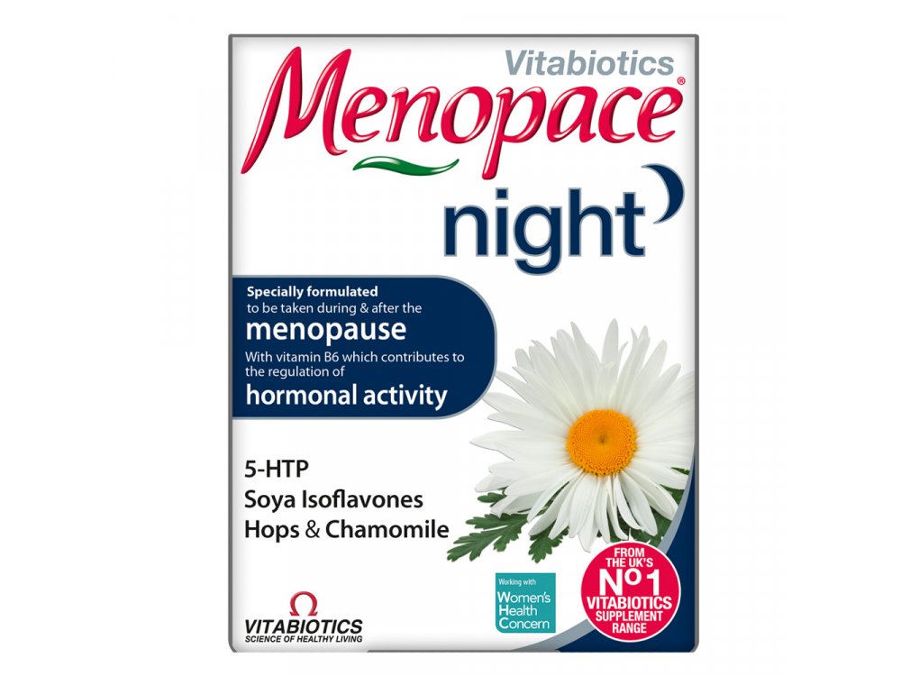 Η σειρά Menopace περιλαμβάνει συμπληρώματα διατροφής ειδικά σχεδιασμένα για τις γυναίκες στην εμμηνόπαυση, καθώς και λίγο πριν ή μετά από αυτήν. Το Menopace περιλαμβάνει ταμπλέτες με ένα μοναδικό συνδυασμό 21 βιταμινών, μετάλλων και ισοφλαβονών: οι ισοφλαβόνες είναι φυτικές ουσίες που βοηθούν στη ρύθμιση των ορμονών και τη μείωση των συμπτωμάτων της κλιμακτηρίου οι βιταμίνες και τα μέταλλα στην υγεία της καρδιάς, του ανοσοποιητικού, των οστών, των νεύρων, του δέρματος και του κόλπου. Το Menopace Night είναι ένας μοναδικός συνδυασμός συστατικών που απευθύνεται ειδικά στις γυναίκες στην εμμηνόπαυση που υποφέρουν από έντονα ?νυχτερινά? συμπτώματα όπως ανησυχία, ευερεθιστικότητα & διαταραχές στον ύπνο. Τα εκχυλίσματα από χαμομήλι και λυκίσκο (hops) βοηθούν στη χαλάρωση, την ηρεμία και τον ομαλό ύπνο. Η 5-HTP (5-υδροξυτρυπτοφάνη) συμβάλλει στη συναισθηματική σταθερότητα και στην καλή ποιότητα του ύπνου. Το Menopace Night περιέχει επιπλέον όλα τα συστατικά του Menopace Original και προσφέρει όλα του τα οφέλη. Περιεκτικότητες ανά ταμπλέτα Εκχύλισμα Λυκίσκου 50mg 5-HTP 20mg Εκχύλισμα Χαμομηλιού 50mg Εκχύλισμα Σόγιας 50mg, αποδίδει ισοφλαβόνες 20mg Βιταμίνη A (2500IU) 750μg Βιταμίνη D (ως D3 1000IU) 25μg Βιταμίνη E (Φυσική Πηγή) 30mg Βιταμίνη C 45mg Βιταμίνη B1 (Θειαμίνη) 15mg Βιταμίνη B2 (Ριβοφλαβίνη) 5mg Βιταμίνη B3 (Νιασίνη) 24mg Βιταμίνη B6 10mg Φυλλικό Οξύ 400μg Βιταμίνη B12 20μg Βιοτίνη 50μg Παντοθενικό Οξύ 30mg Μαγνήσιο 60mg Σίδηρο 6mg Ψευδάργυρο 15mg Χαλκό 1000μg Μαγγάνιο 2mg Σελήνιο 110μg Χρώμιο 40μg Ιώδιο 150μg Δεν περιέχει: συντηρητικά, τεχνητά χρώματα, γλουτένη, ζελατίνη, λακτόζη, αλάτι, μαγιά, φαρμακευτικές ουσίες ή ορμόνες. Συνιστώμενη δοσολογία: 1 ταμπλέτα την ημέρα μετά το βραδινό γεύμα μαζί με νερό ή κρύο ρόφημα. Η λήψη του μπορεί να συνεχιστεί και μετά την εμμηνόπαυση για όσο απαιτείται. Δεν απαιτείται η παράλληλη λήψη κάποιας άλλης πολυβιταμίνης. Κατάλληλο για χορτοφάγους.