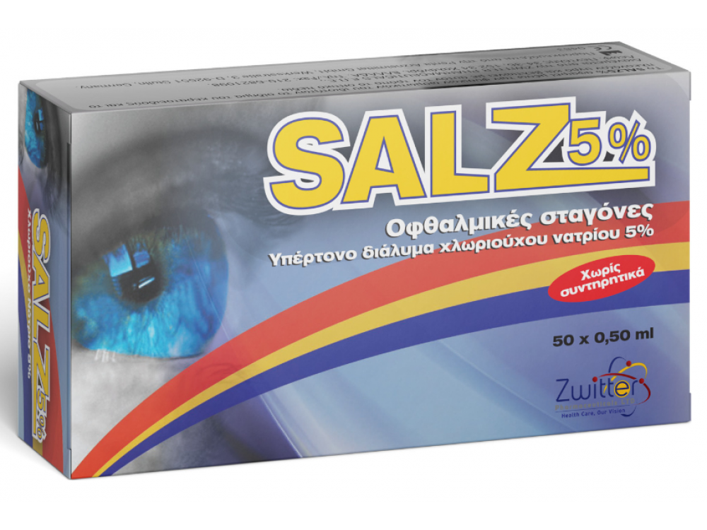 To SALZ 5% είναι ένα στείρο, υπέρτονο, χωρίς συντηρητικά, αλατούχο διάλυμα σε περιέκτες μιας χρήσης. Το SALZ 5% αφαιρεί μέσω των φυσικών ωσμωτικών του ιδιοτήτων το οίδημα του κερατοειδούς και το πλεονάζον υγρό και βελτιώνει με αυτόν τον τρόπο το οπτικό πεδίο. Το SALZ 5% βρίσκει χρήσεις, παραδείγματος χάριν, μετά από οφθαλμικές επεμβάσεις και βοηθάει στην αντιμετώπιση του οιδήματος του κερατοειδούς που προκαλείται από τις διαγνωστικές εξετάσεις του οφθαλμού. Οδηγίες Χρήσης: Χρησιμοποιήστε 3-5 φορές ημερησίως μια σταγόνα στο σάκο του επιπεφυκότα στον πάσχοντα οφθαλμό. Αποφύγετε κάθε επαφή του ανοίγματος με τον οφθαλμό και με τα χέρια. Προειδοποιήσεις και προφυλάξεις: Να μην χρησιμοποιείτε κατεστραμμένους περιέκτες μιας χρήσης. Ο οφθαλμός δεν πρέπει να έρχεται σε επαφή με τον περιέκτη μιας χρήσης. Μόνο για μια φορά να χρησιμοποιείται ο περιέκτης μιας χρήσης; Επειδή το SALZ 5% δεν περιέχει κανένα χημικό συντηρητικό πρέπει το υπόλοιπο του περιέκτη να μην χρησιμοποιείται. Να μην χρησιμοποιείτε τις οφθαλμικές σταγόνες μετά την ημερομηνία λήξης, η οποία αναγράφεται σε κάθε περιέκτη μιας χρήσης.